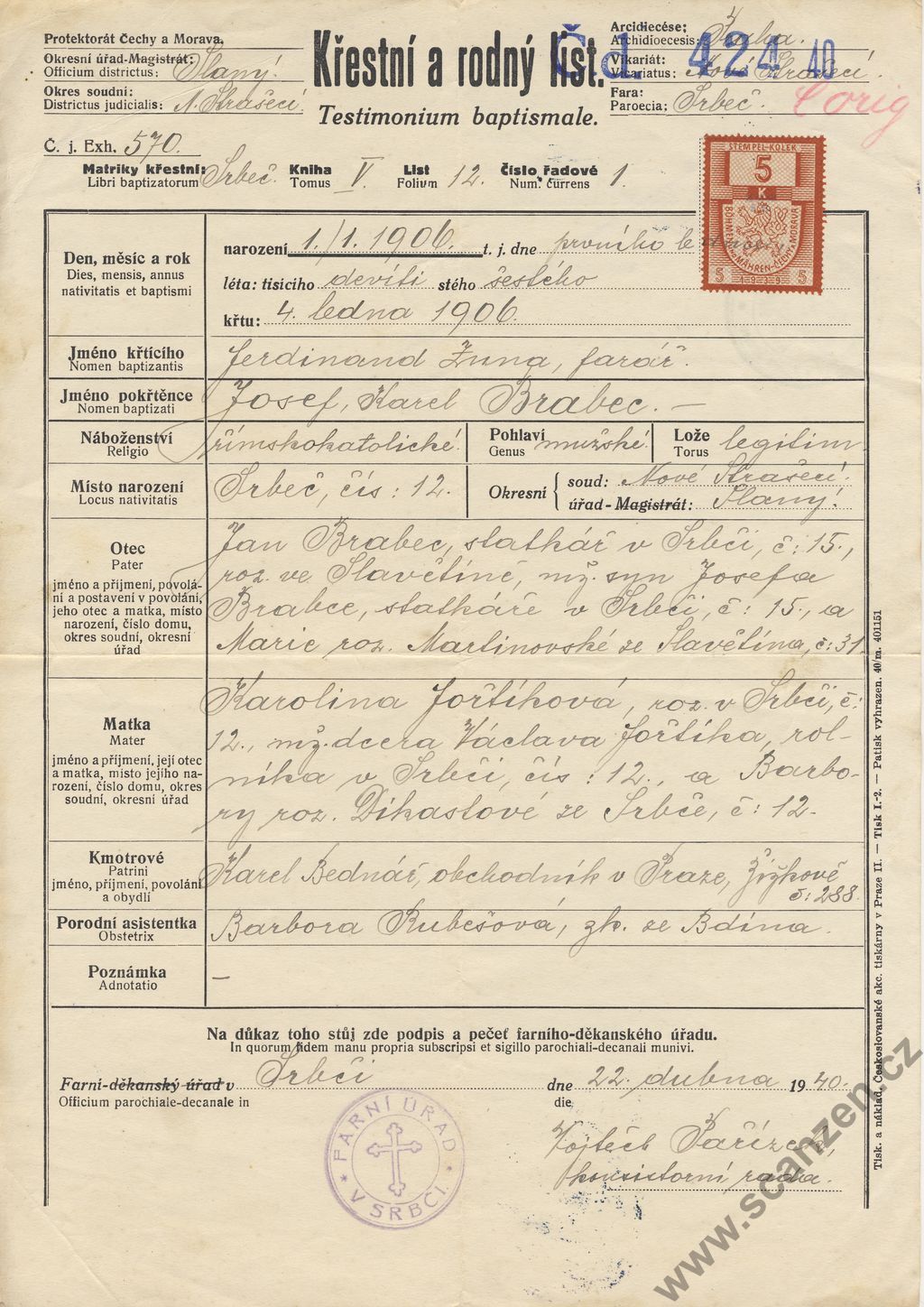 Křestní a rodný list (1940)p1