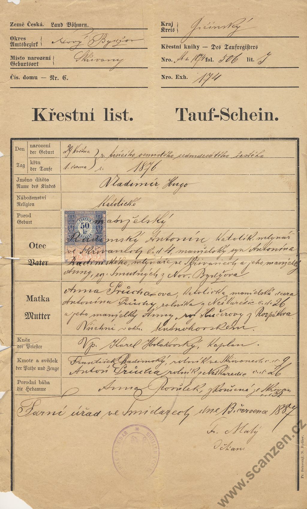 Geburts und Taufschein – Rodný a křestný list – Kounice (1881)
