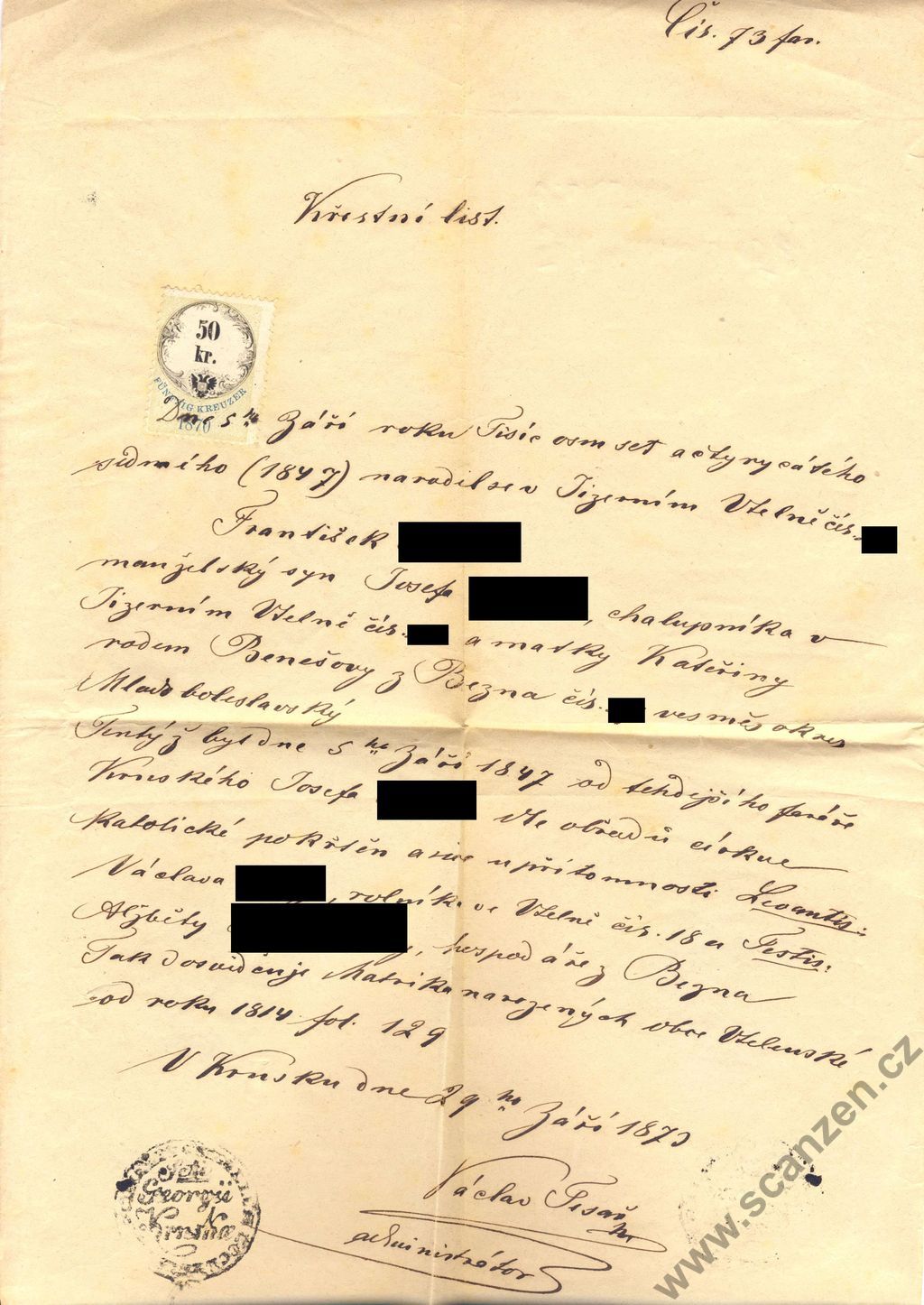 Křestní list (1870)