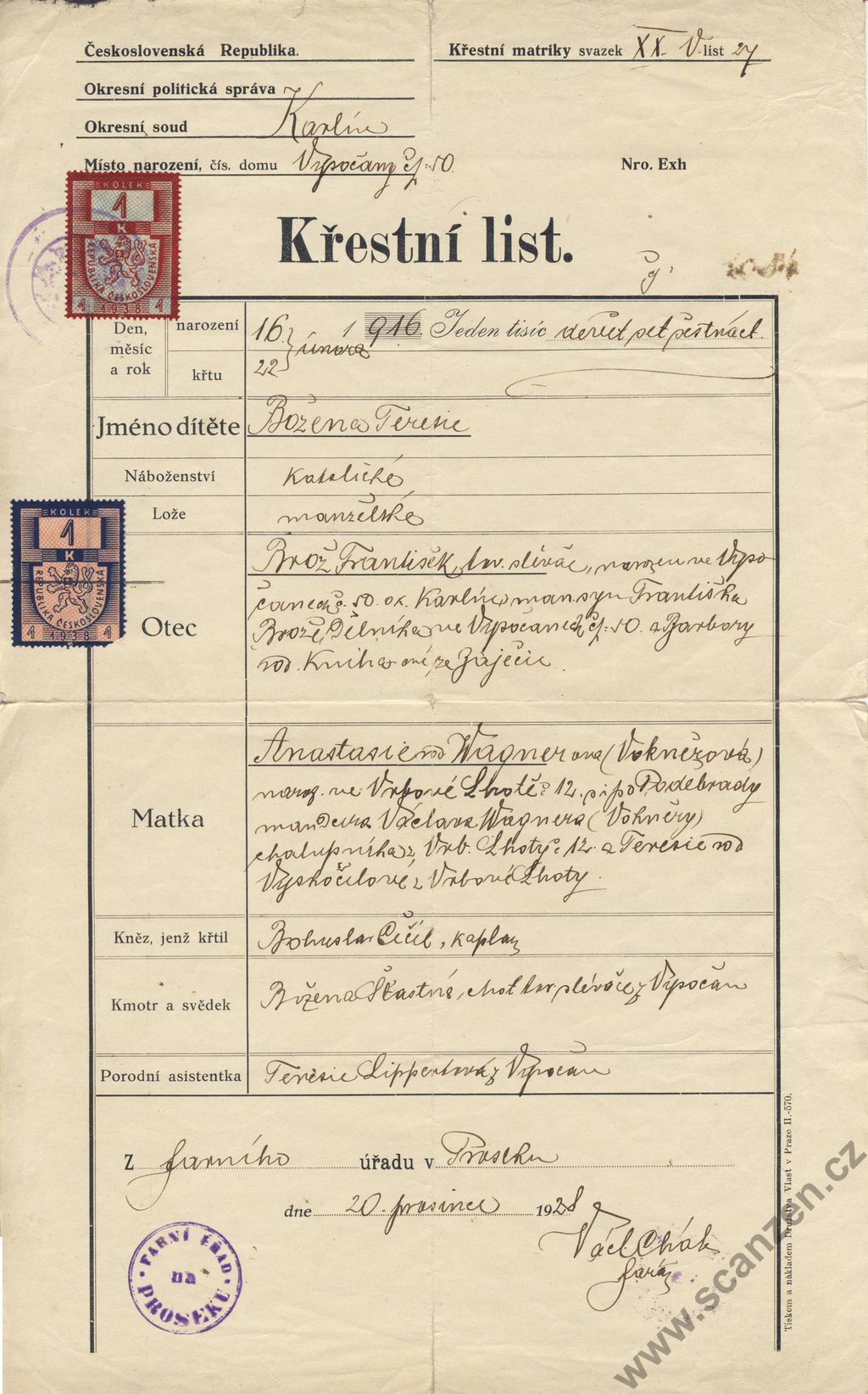 Rodný a křestný list (1920)