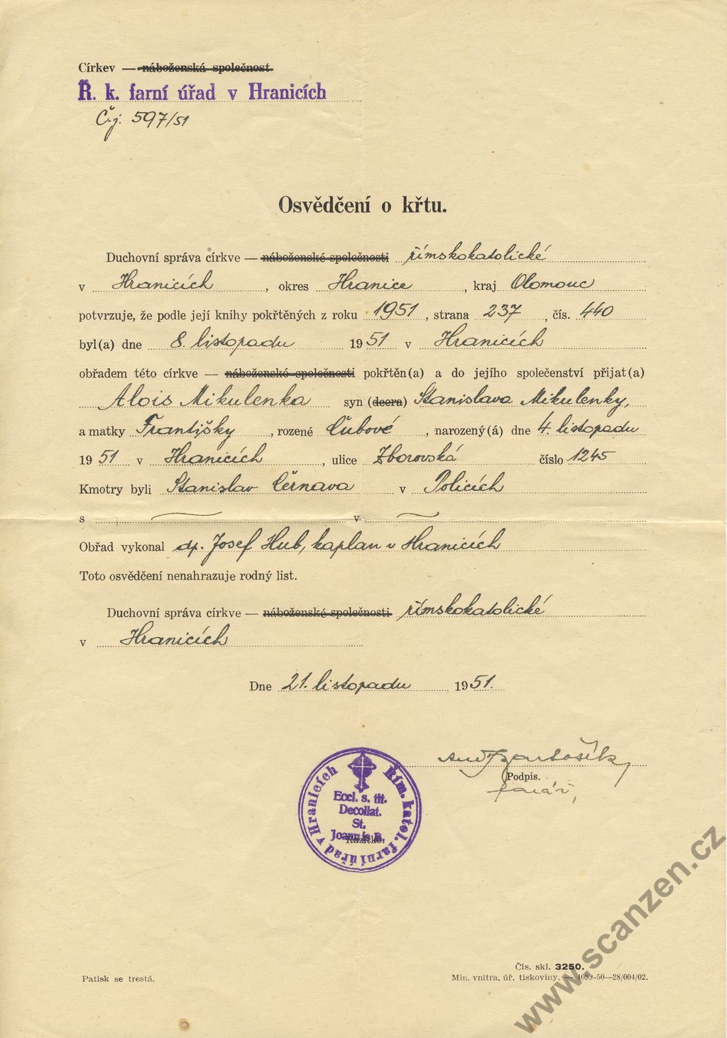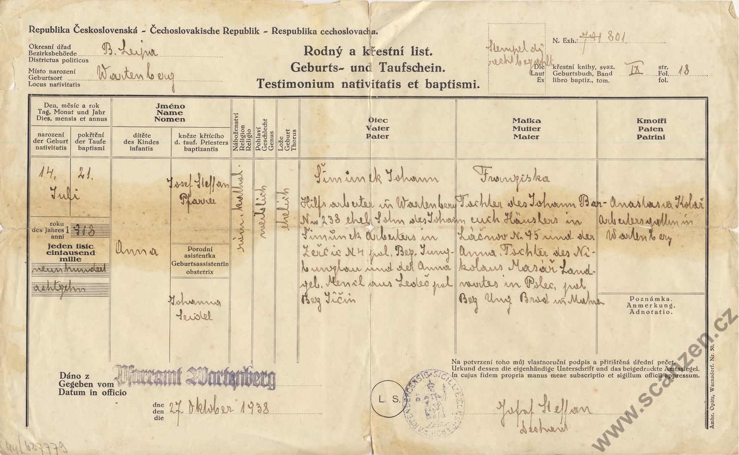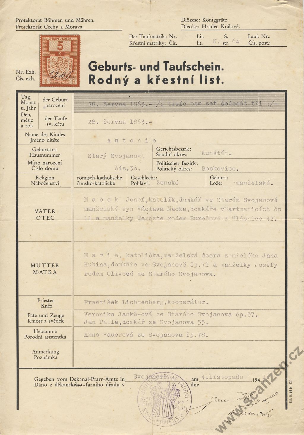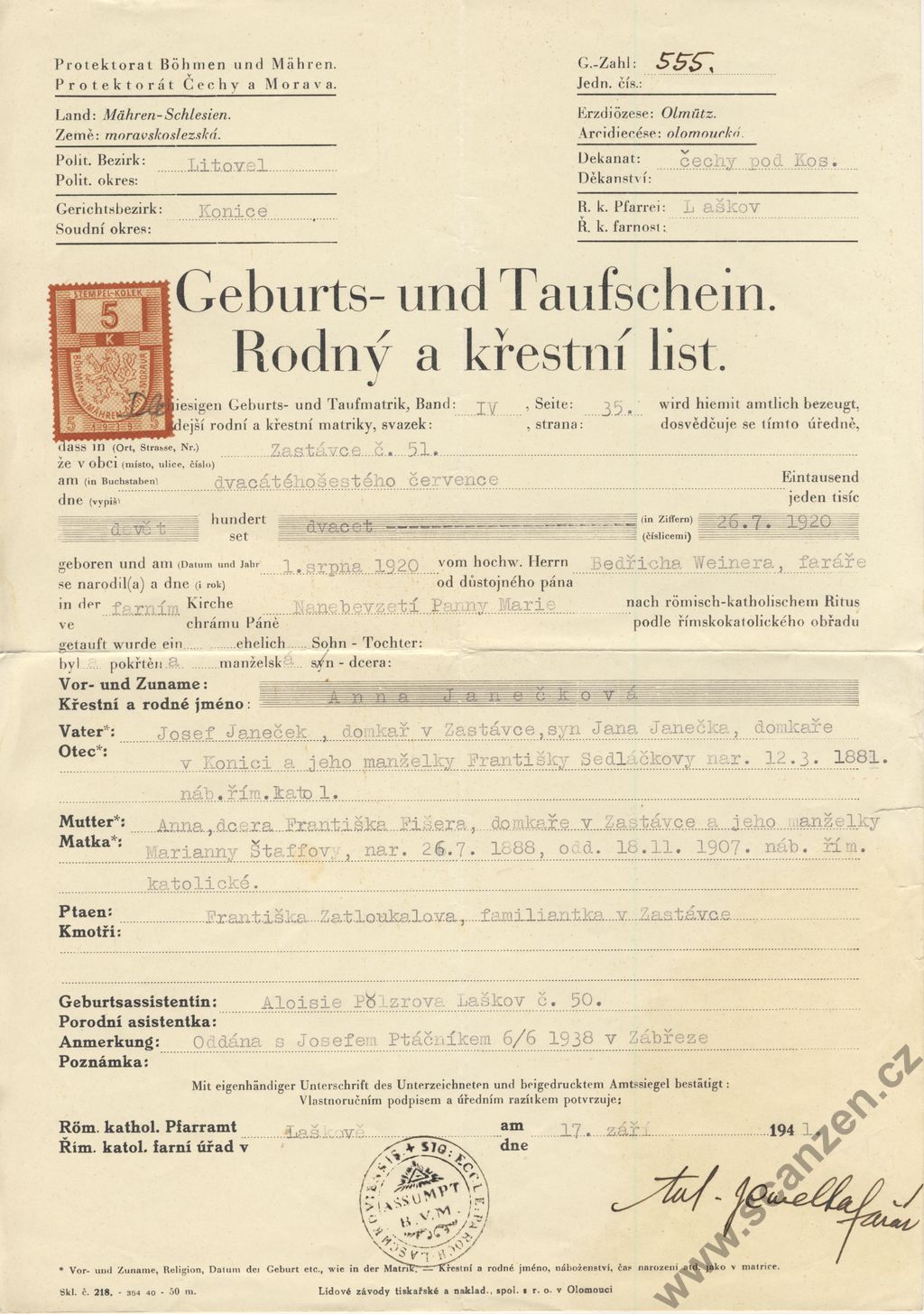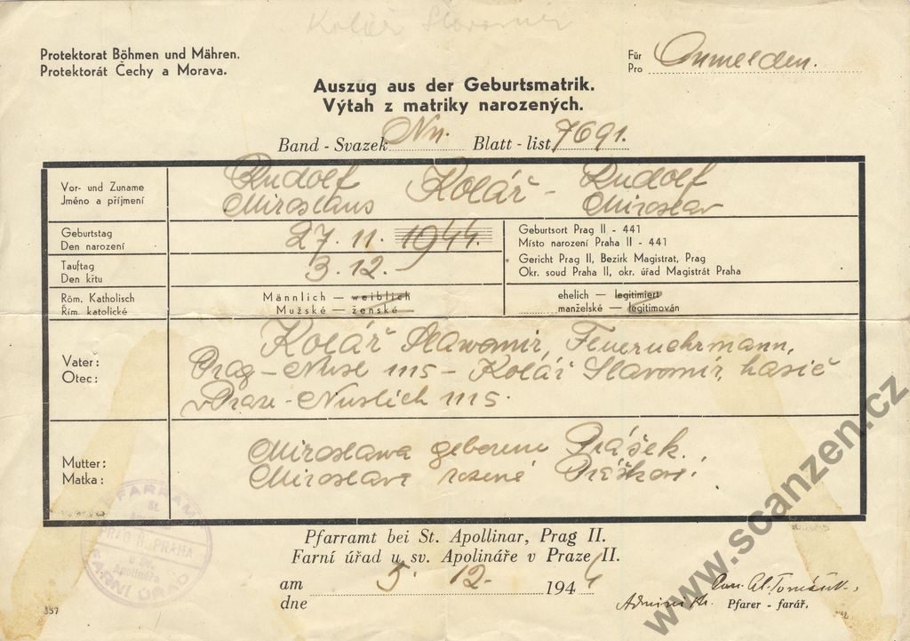 Geburts – und Taufschein – Rodný a křestní list (1941)