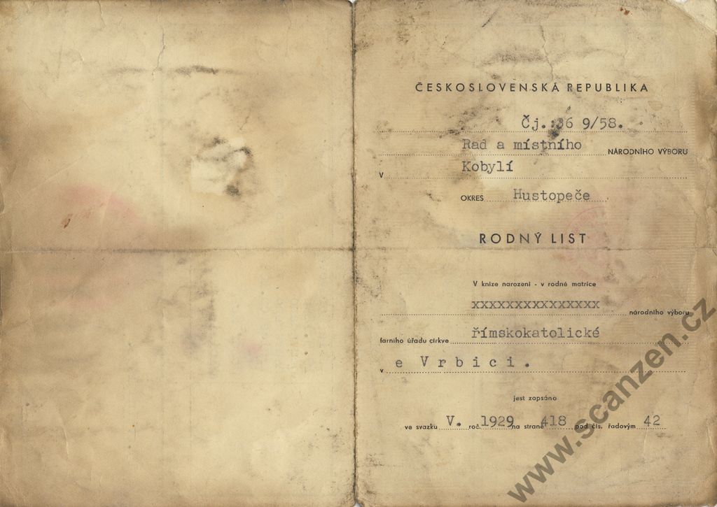 Rodný list (Kobylí 1958) p1