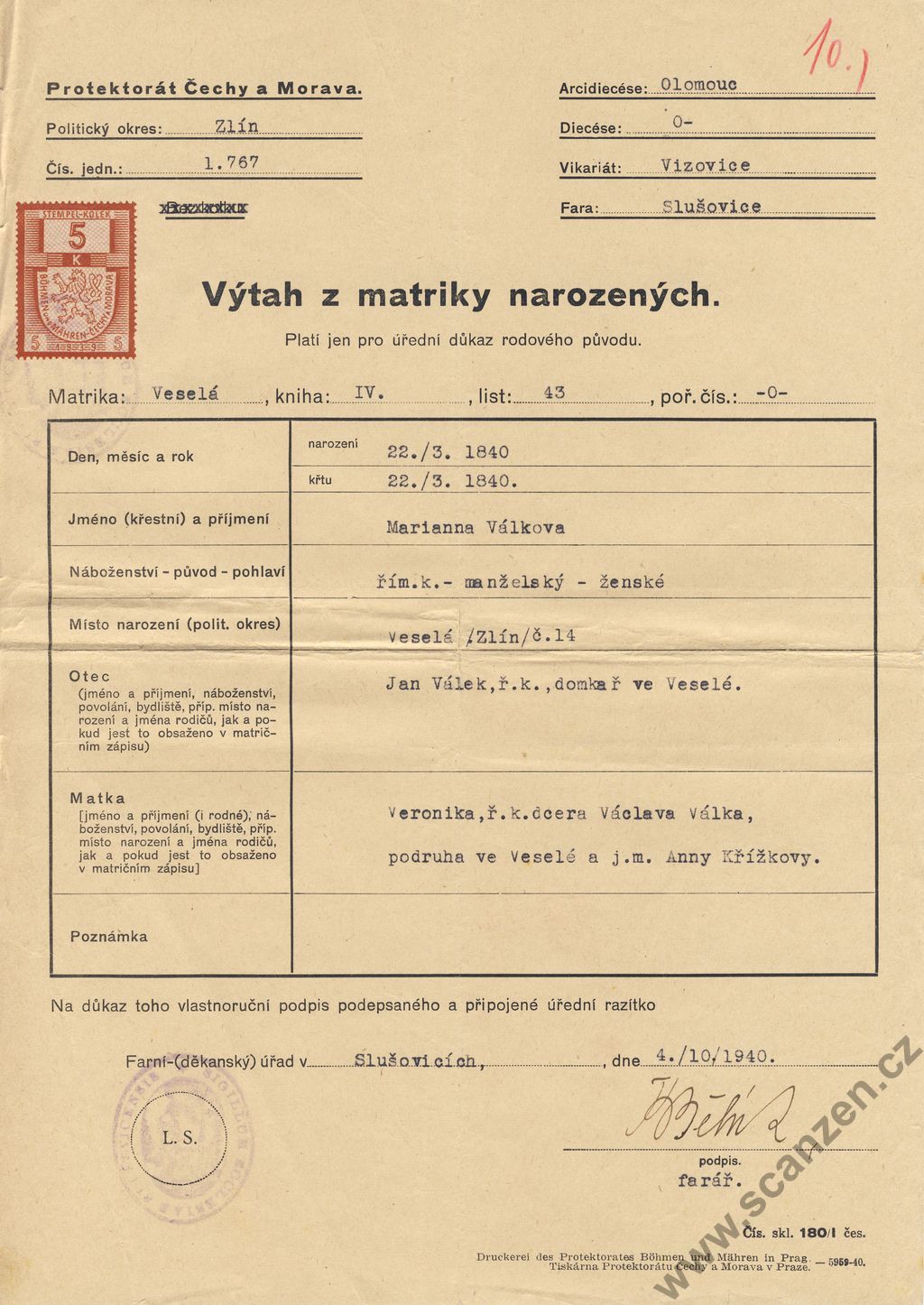 Výtah z matriky narozených (1940)