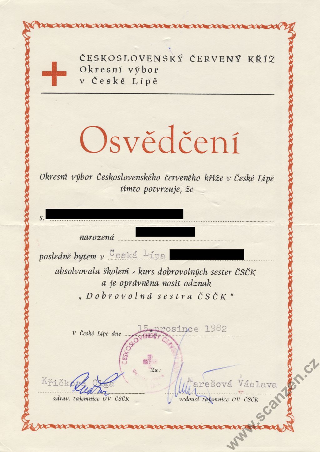 Osvědčení o absolvování kursu dobrovolných sester ČSČK (1982)