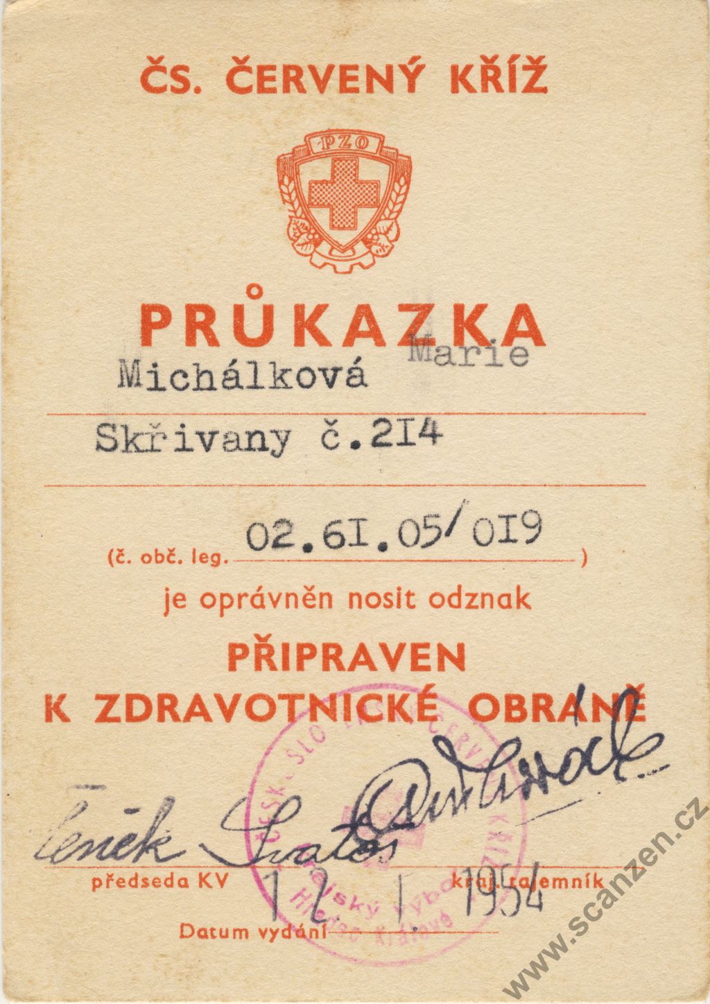 Průkazka Československý červený kříž (1954) p1