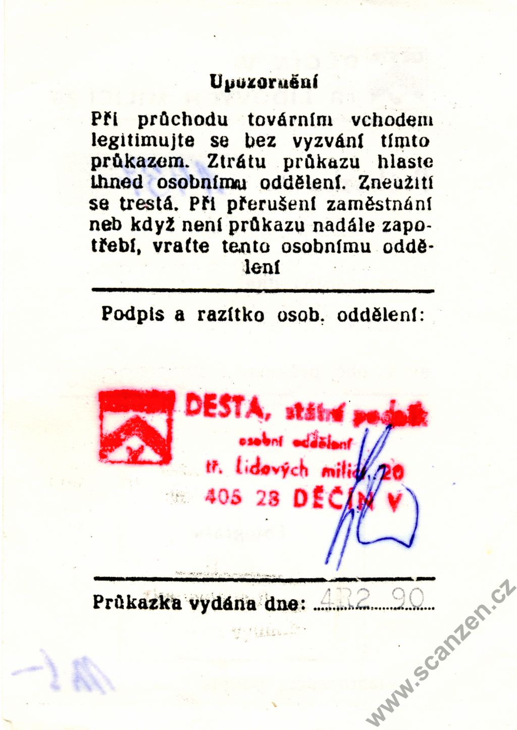 Průkazka ke vstupu Desta Děčín (1990) p2