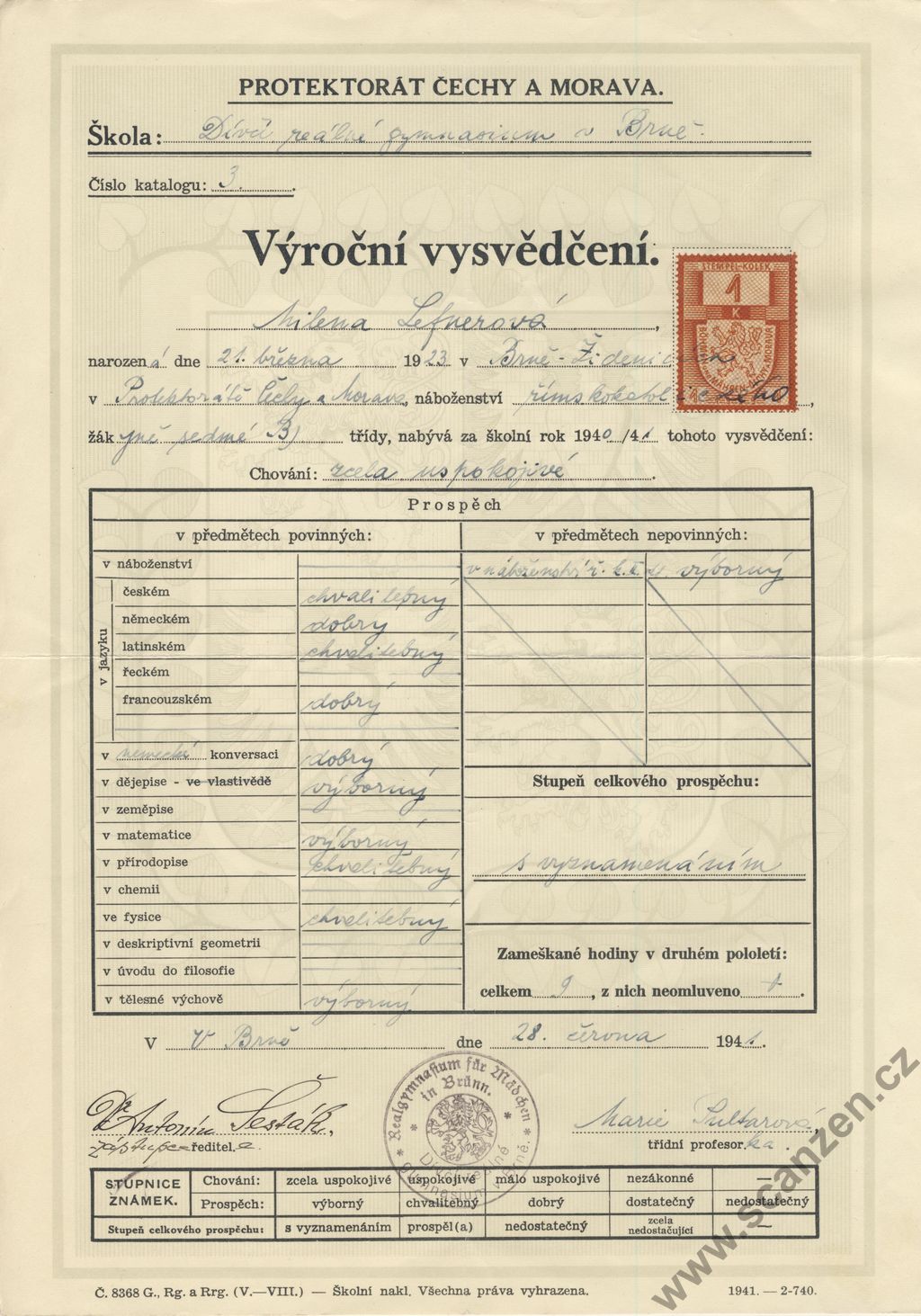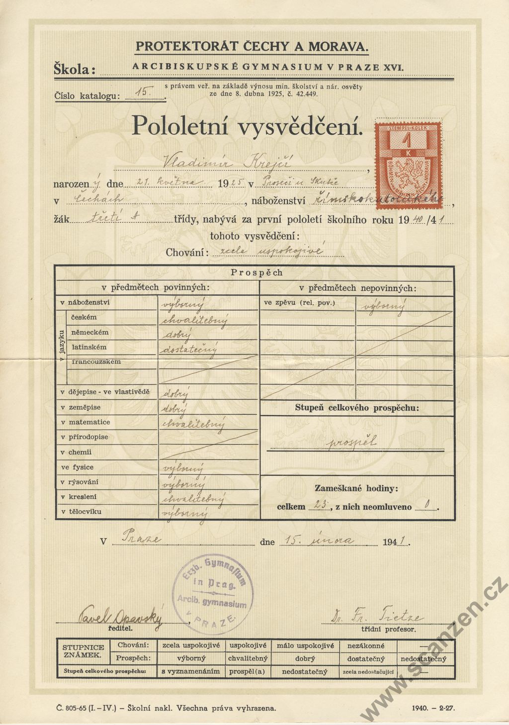 Pololetní vysvědčení Arcibiskupské gymnasium v Praze (1941)