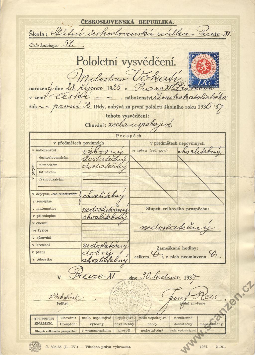 Pololetní vysvědčení státní reálka (1937)