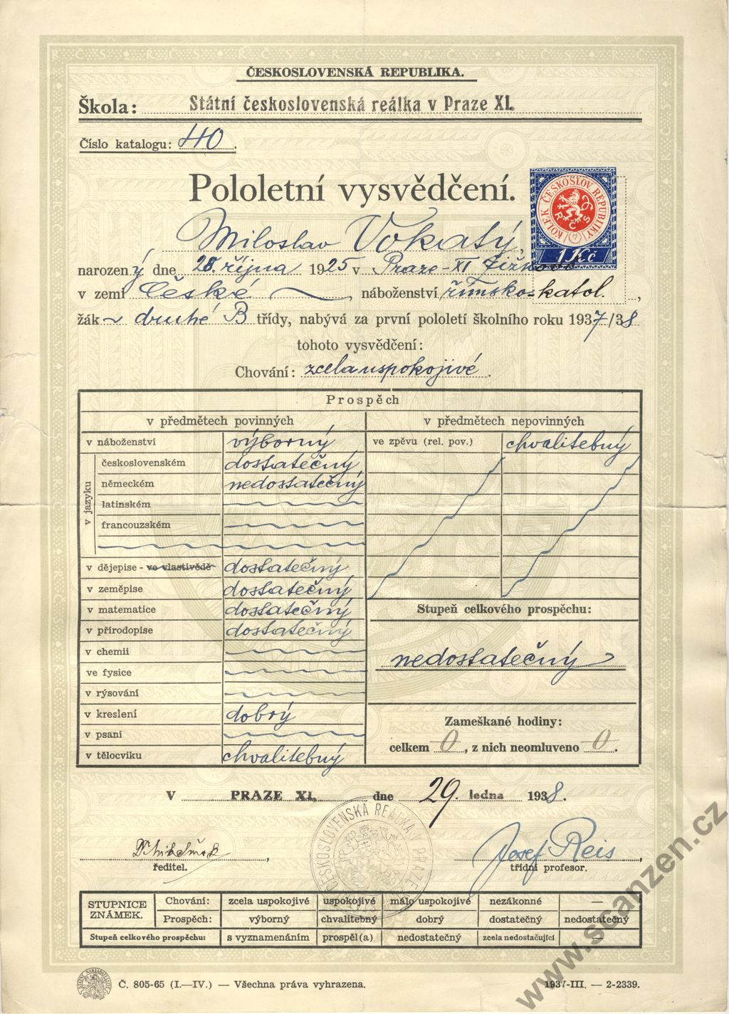 Pololetní vysvědčení státní reálka (1938)