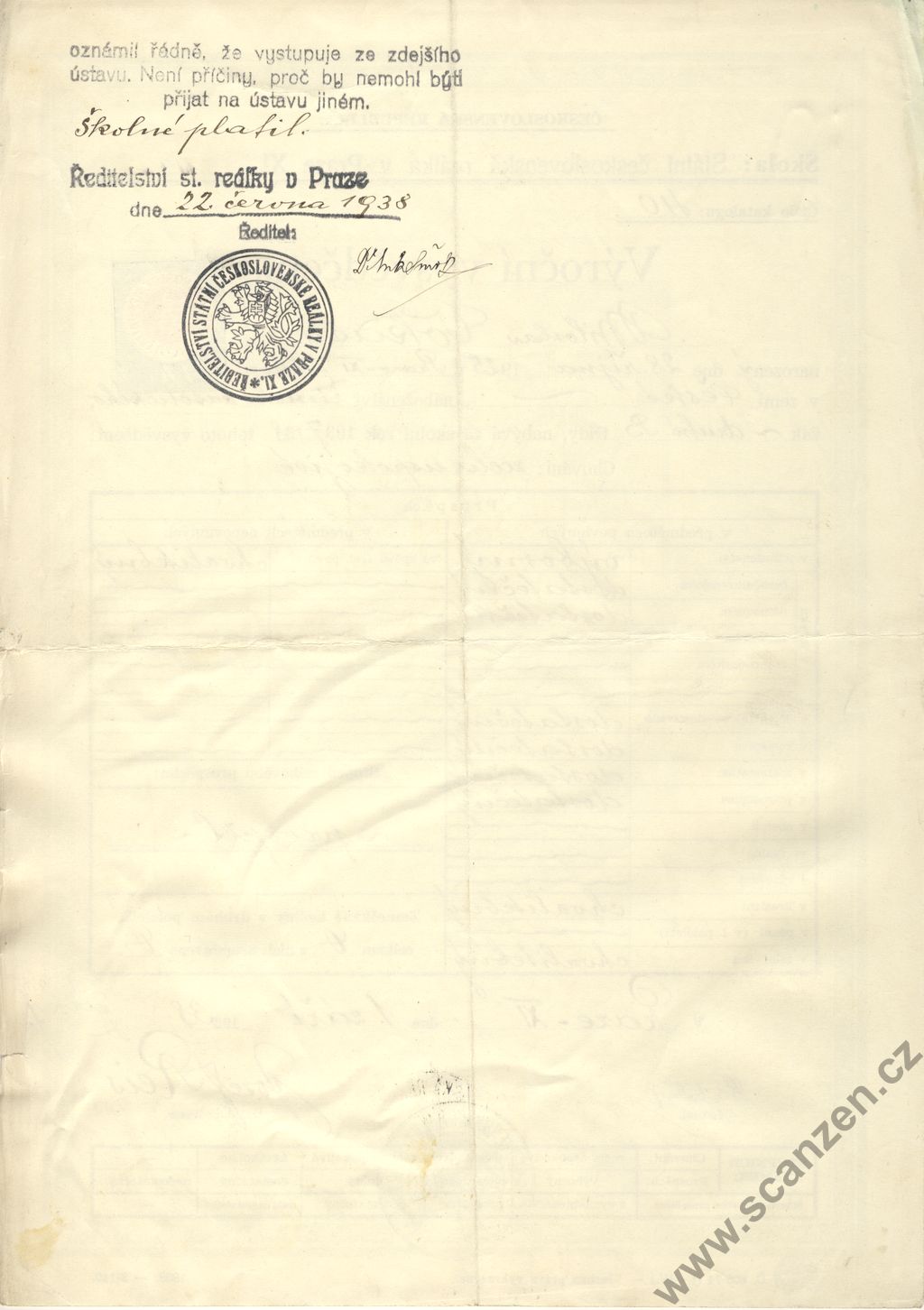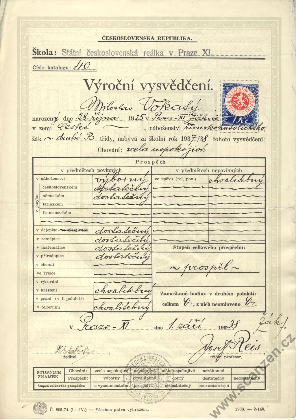 Výroční vysvědčení státní reálka (1938) p1