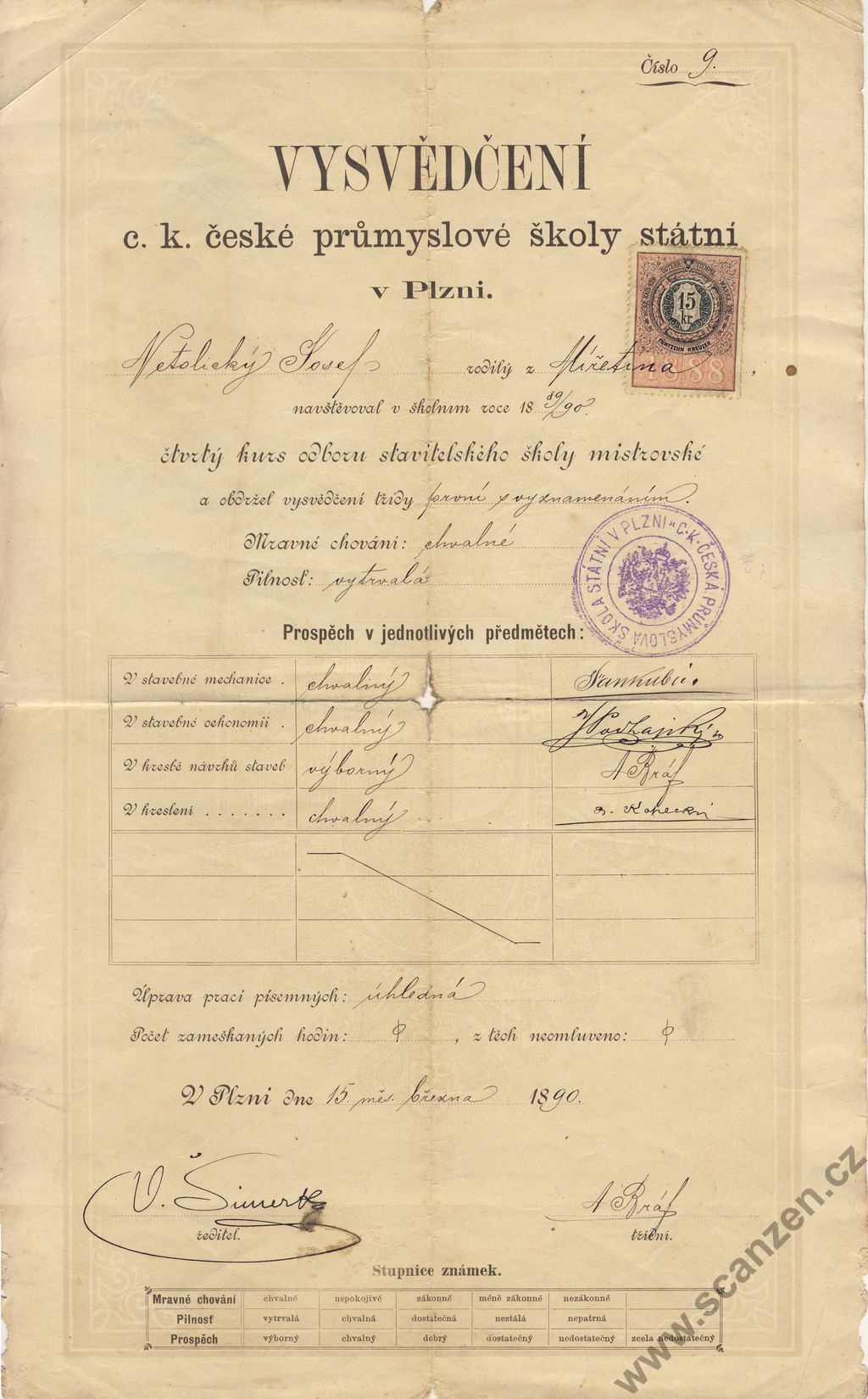 Vysvědčení prům. školy Plzeň (1890)