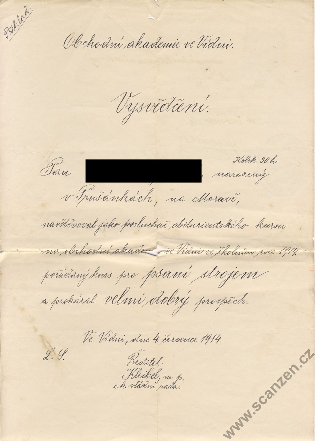 Vysvědčení obchodní akademie (1914) p1