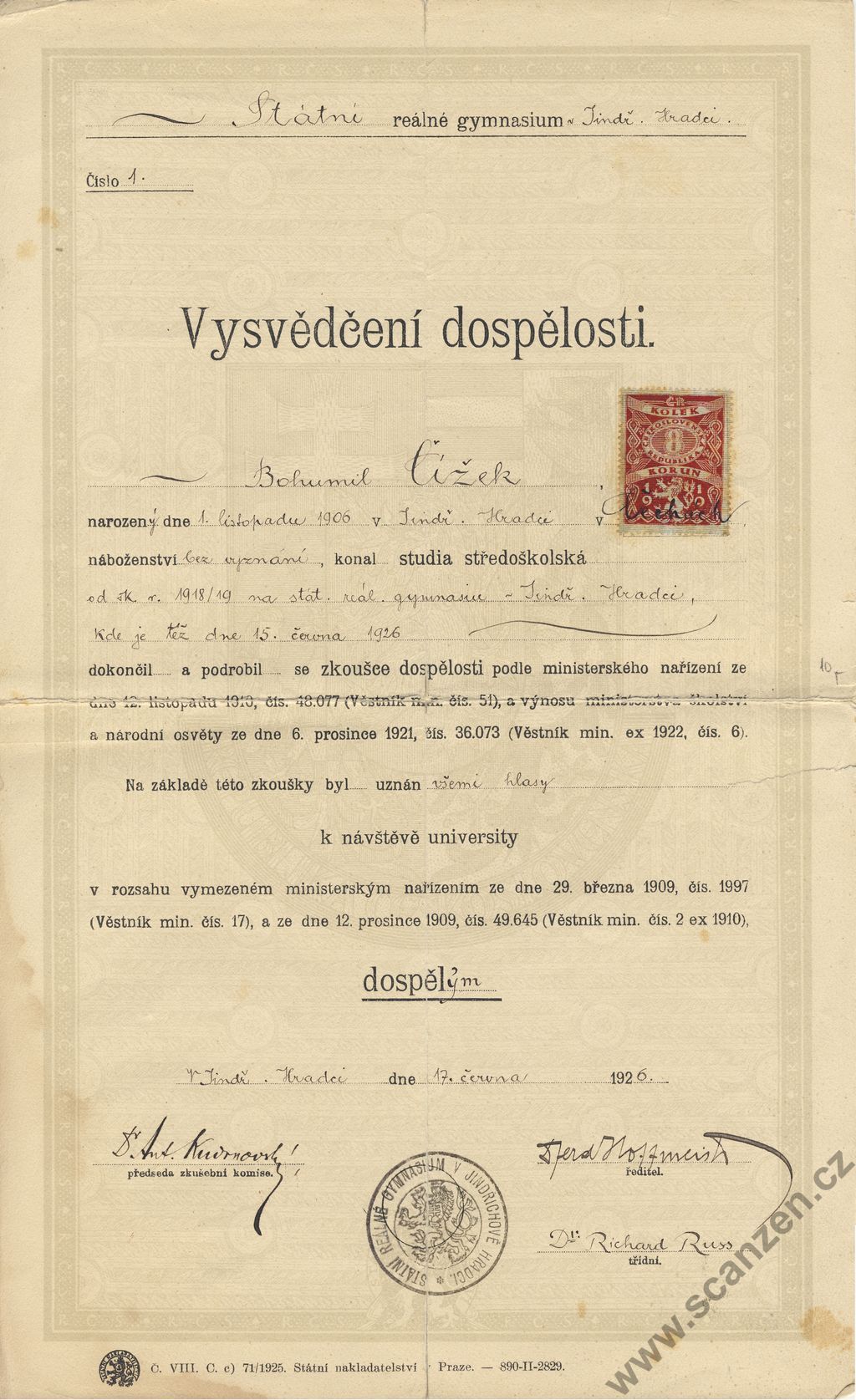 Vysvědčení dospělosti (1926) p1