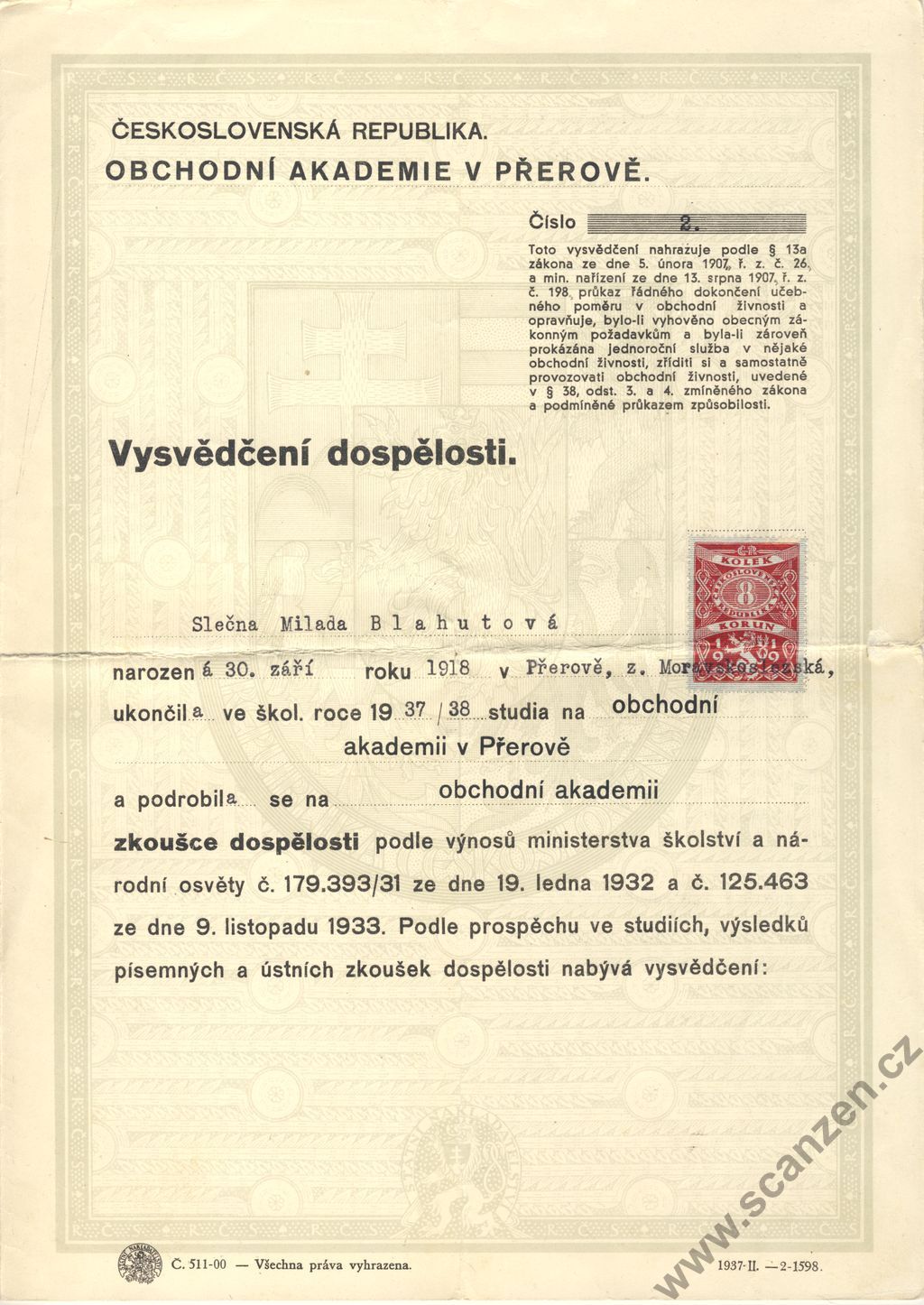 Vysvědčení dospělosti obchodní akademie (1938) p2