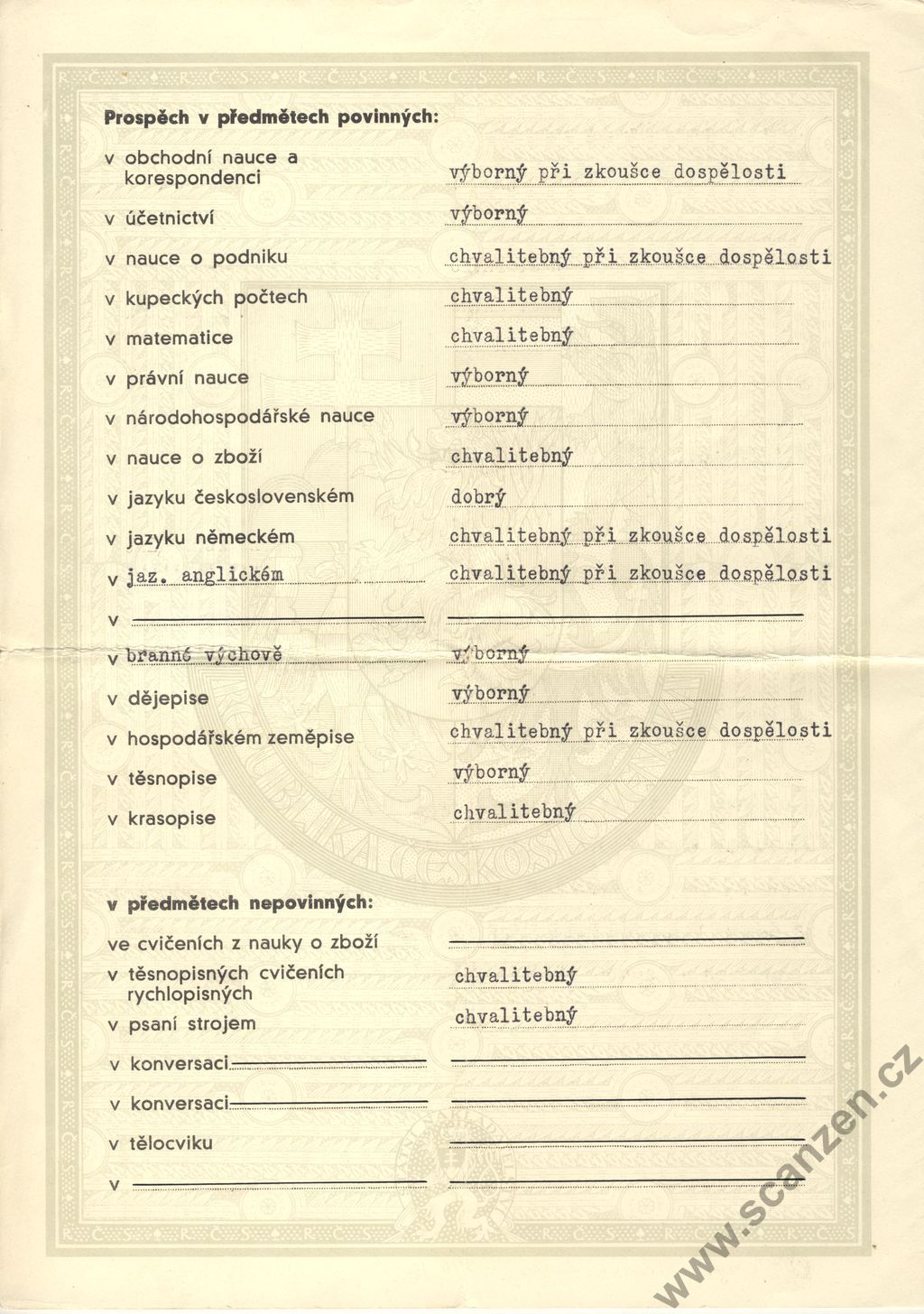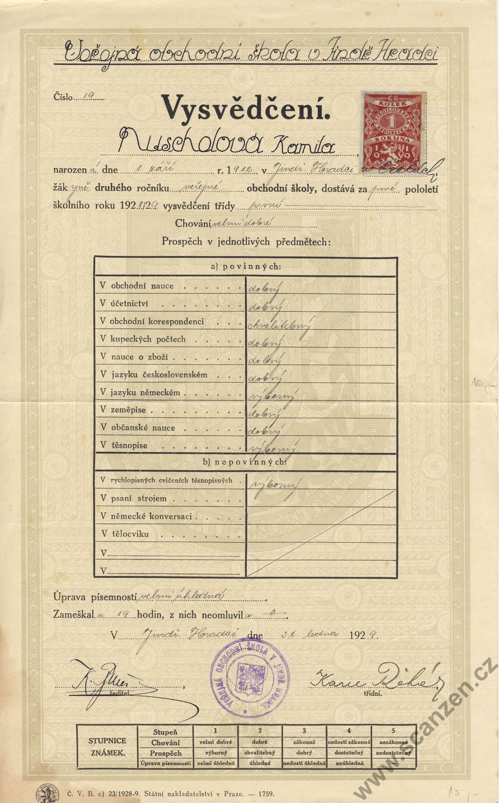 Vysvědčení obchodní škola (1929) p1