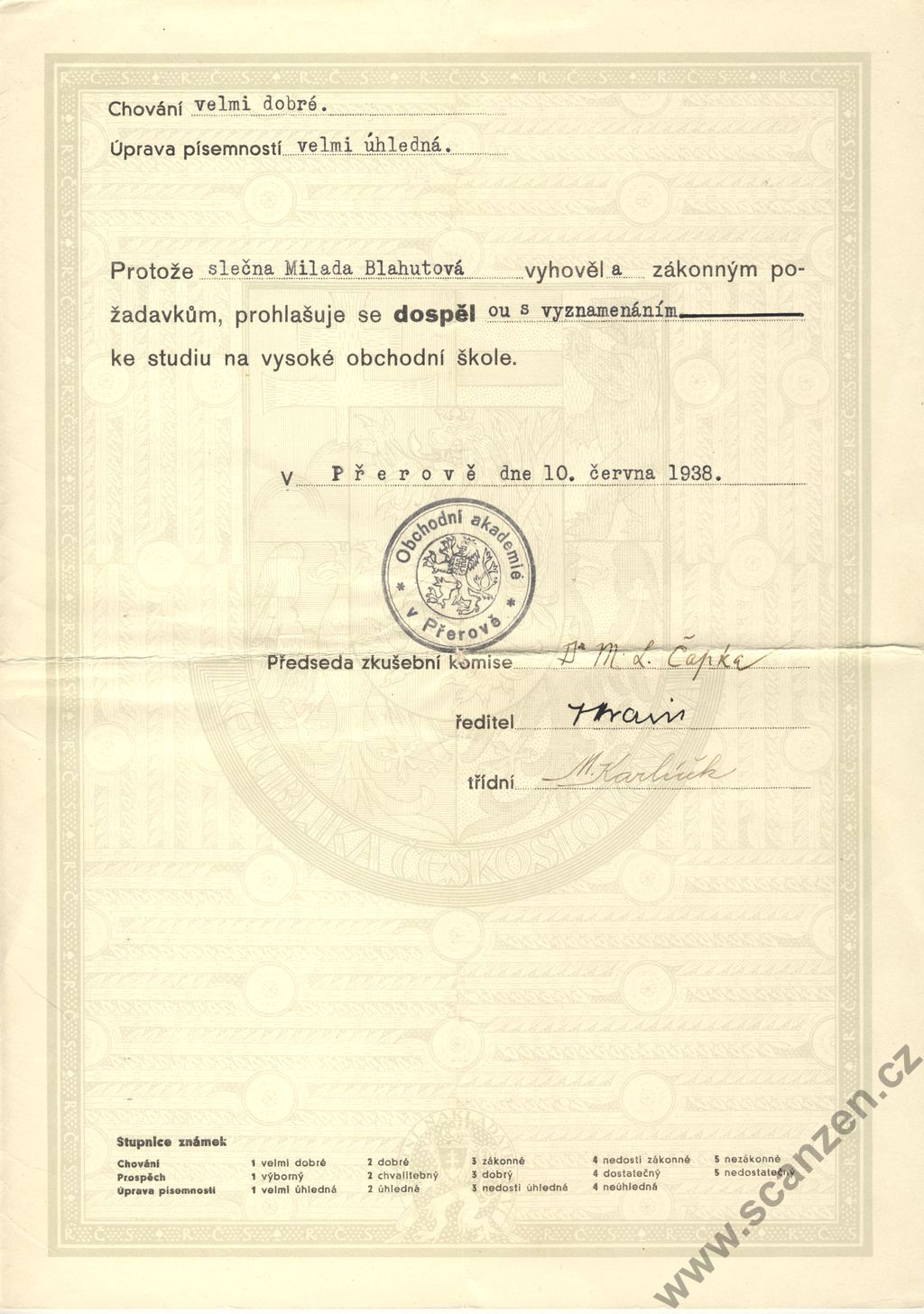 Vysvědčení dospělosti obchodní akademie (1938) p1