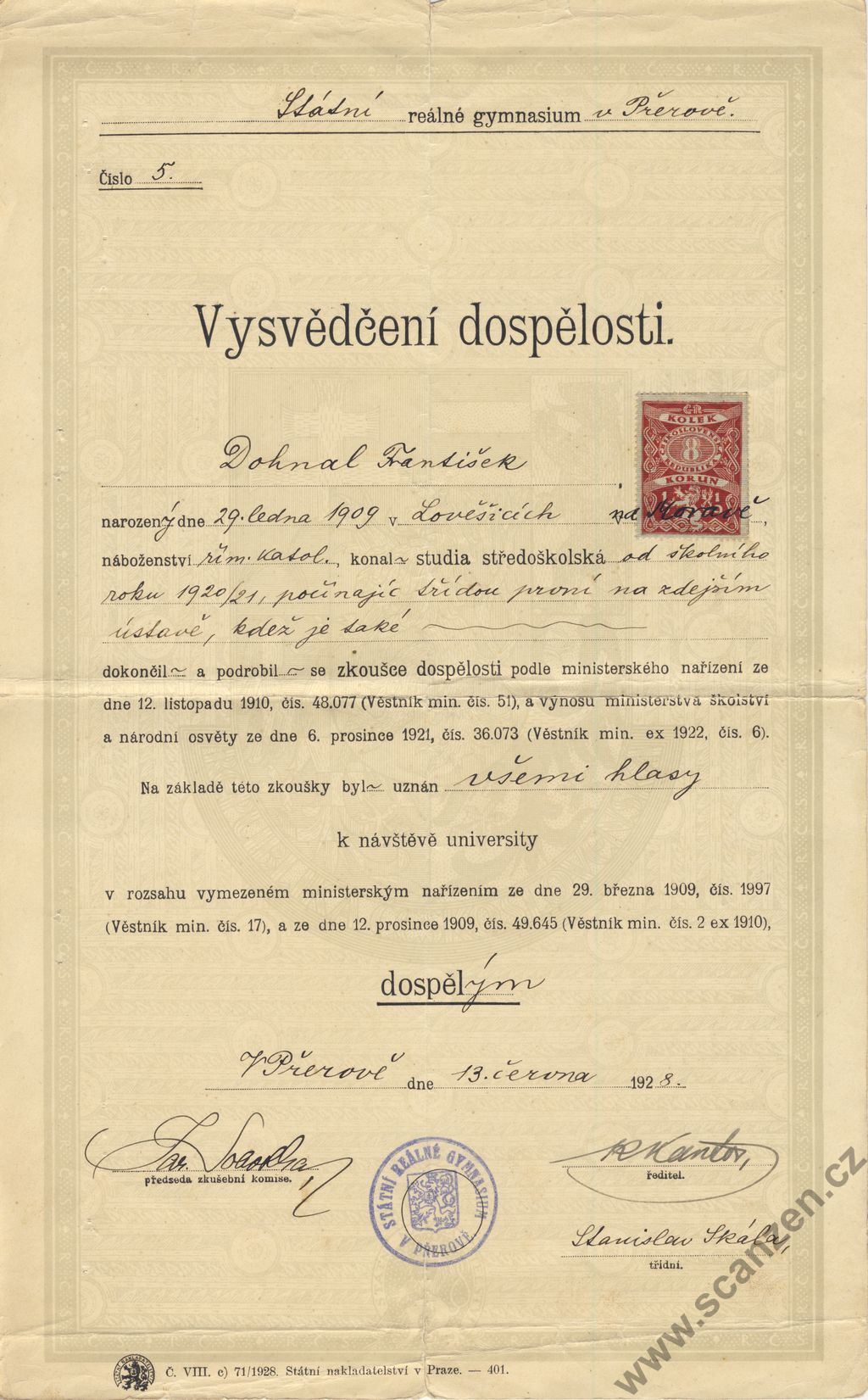 Vysvědčení dospělosti reálné gymnasium (1928)