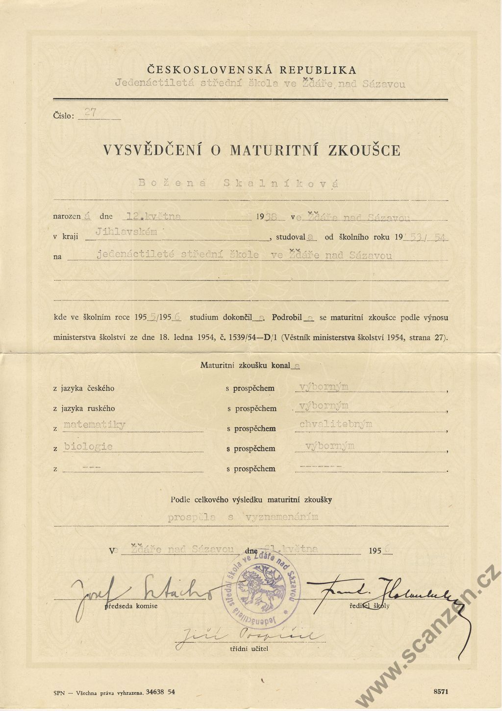 Vysvědčení o maturitní zkoušce (1956) p1