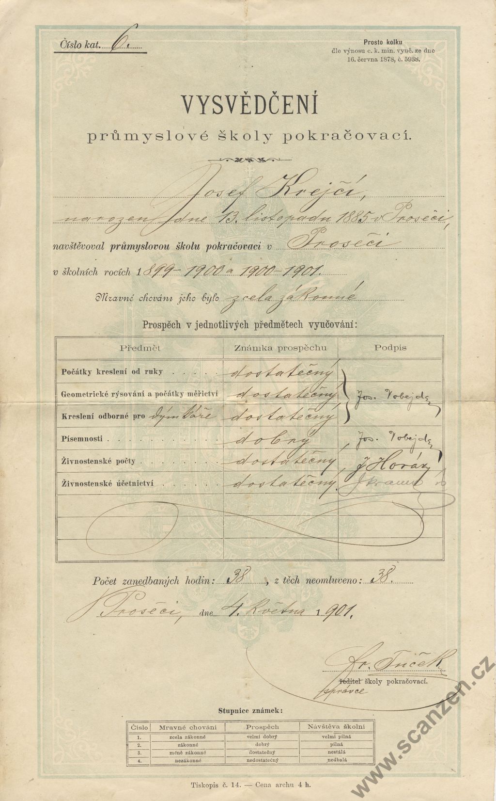 Vysvědčení průmyslové školy pokračovací (1901)