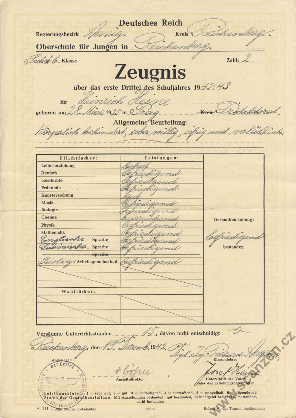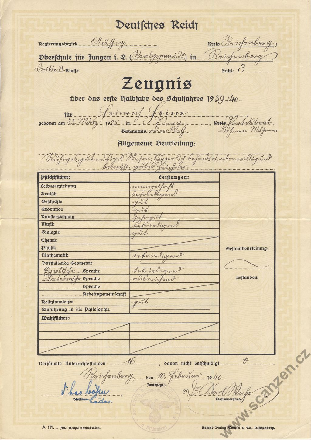 Zeugnis vyšší střední škola v Liberci (1940) p1