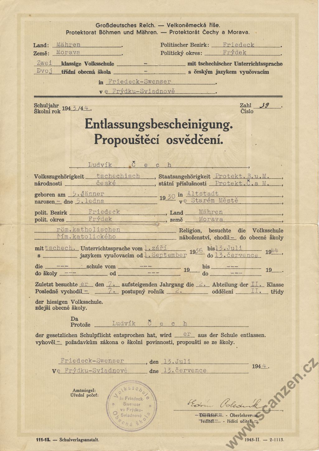 Entlassungszeungnis Volksschule – závěrečné vysvědčení zákl. škola Teplice (1944) p1