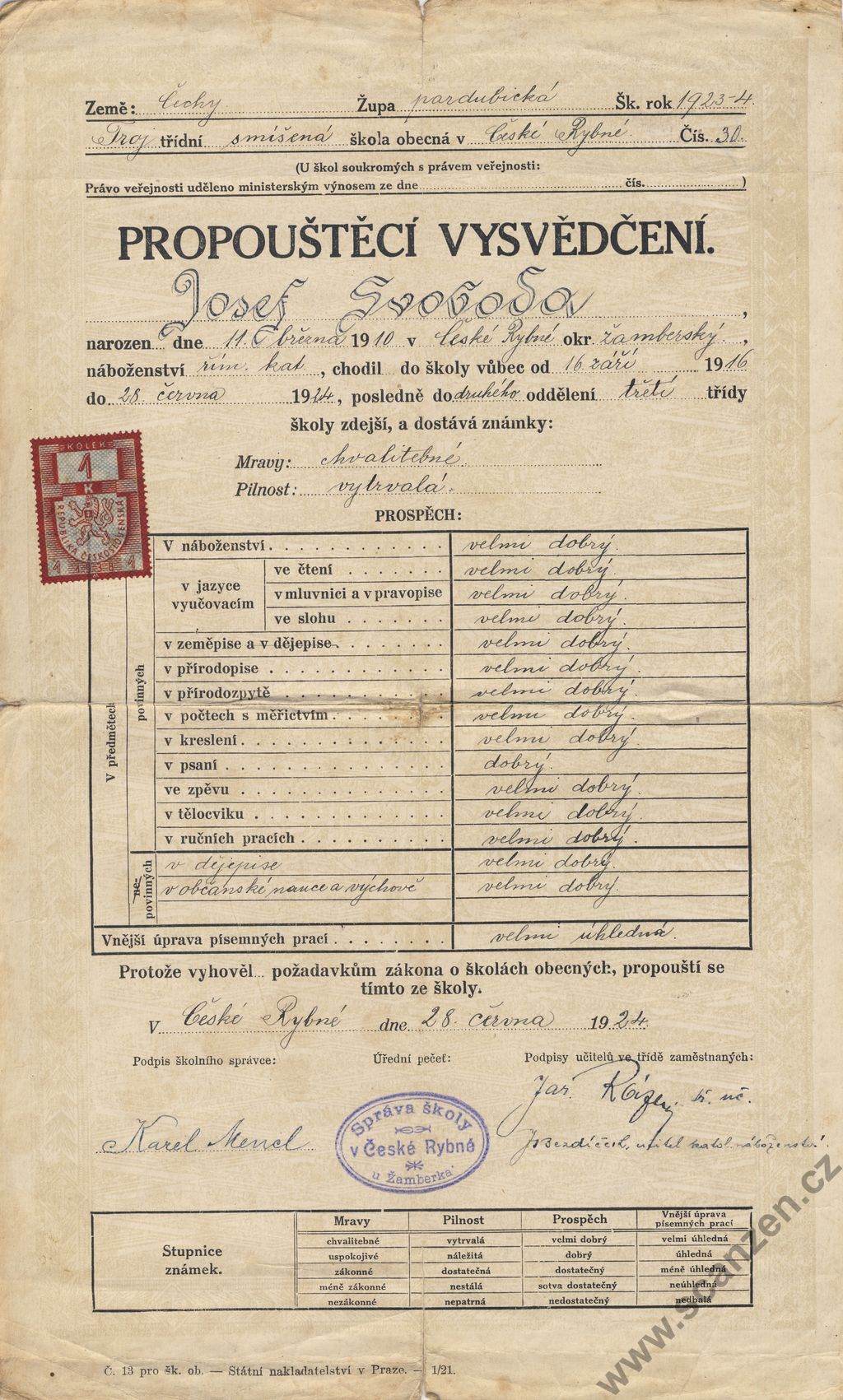 Propouštěcí vysvědčení škola obecná v České Rybné (1924)