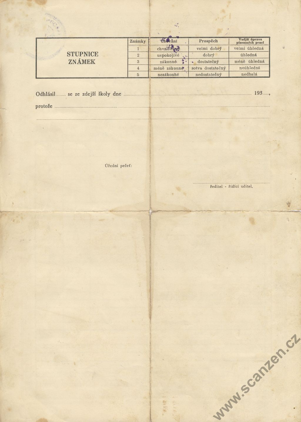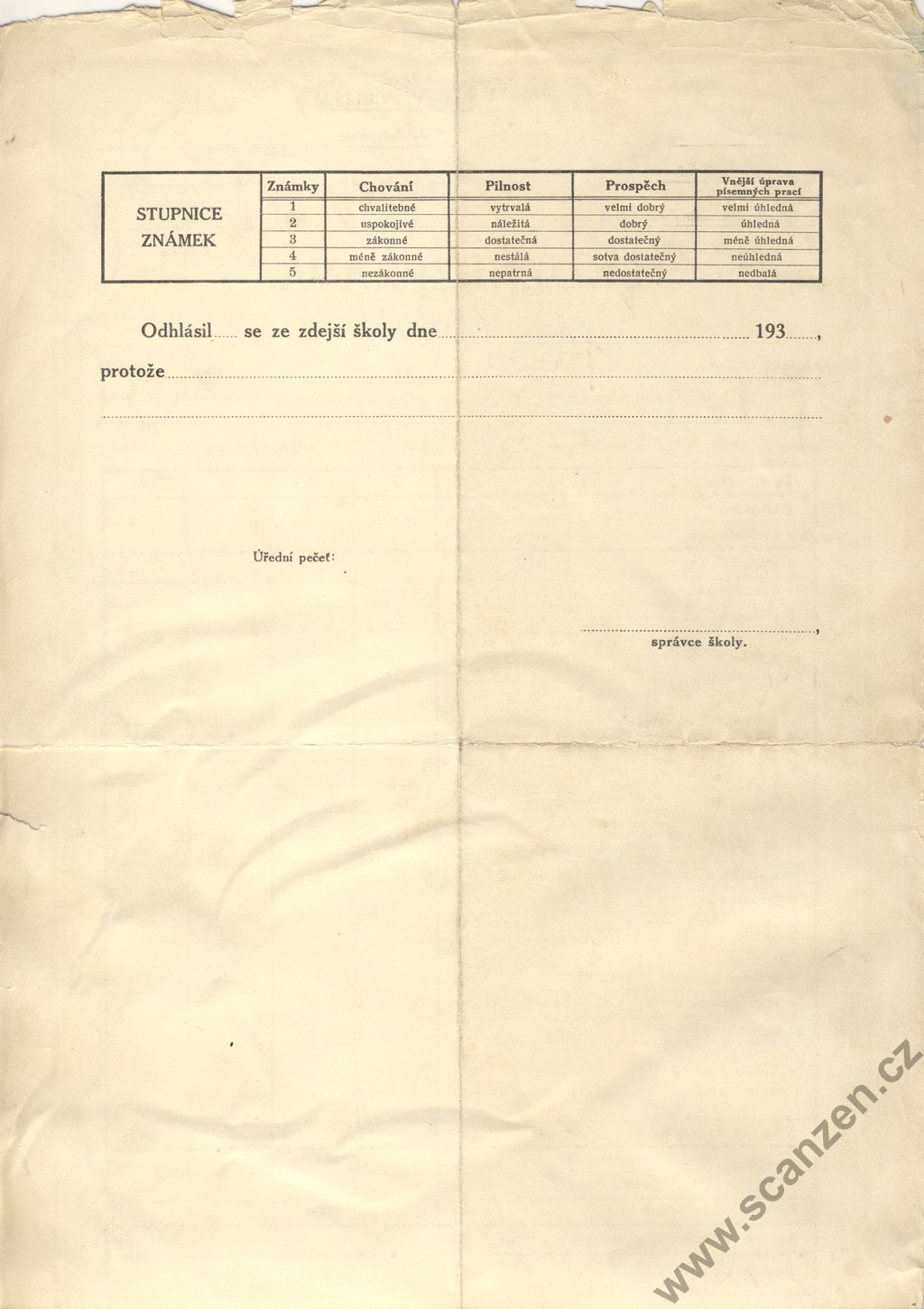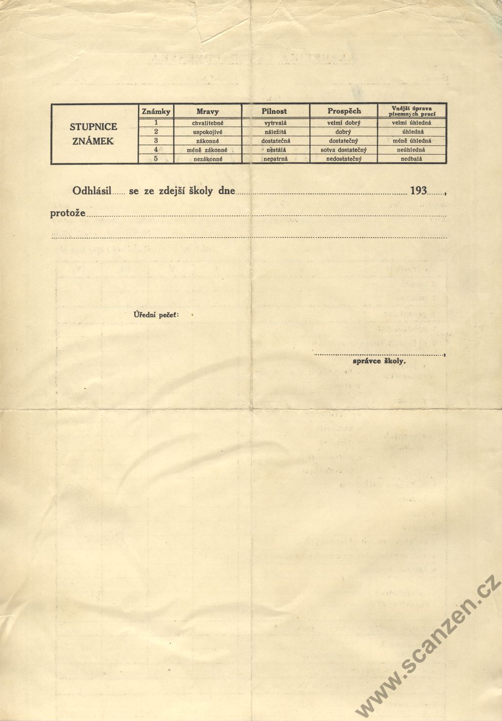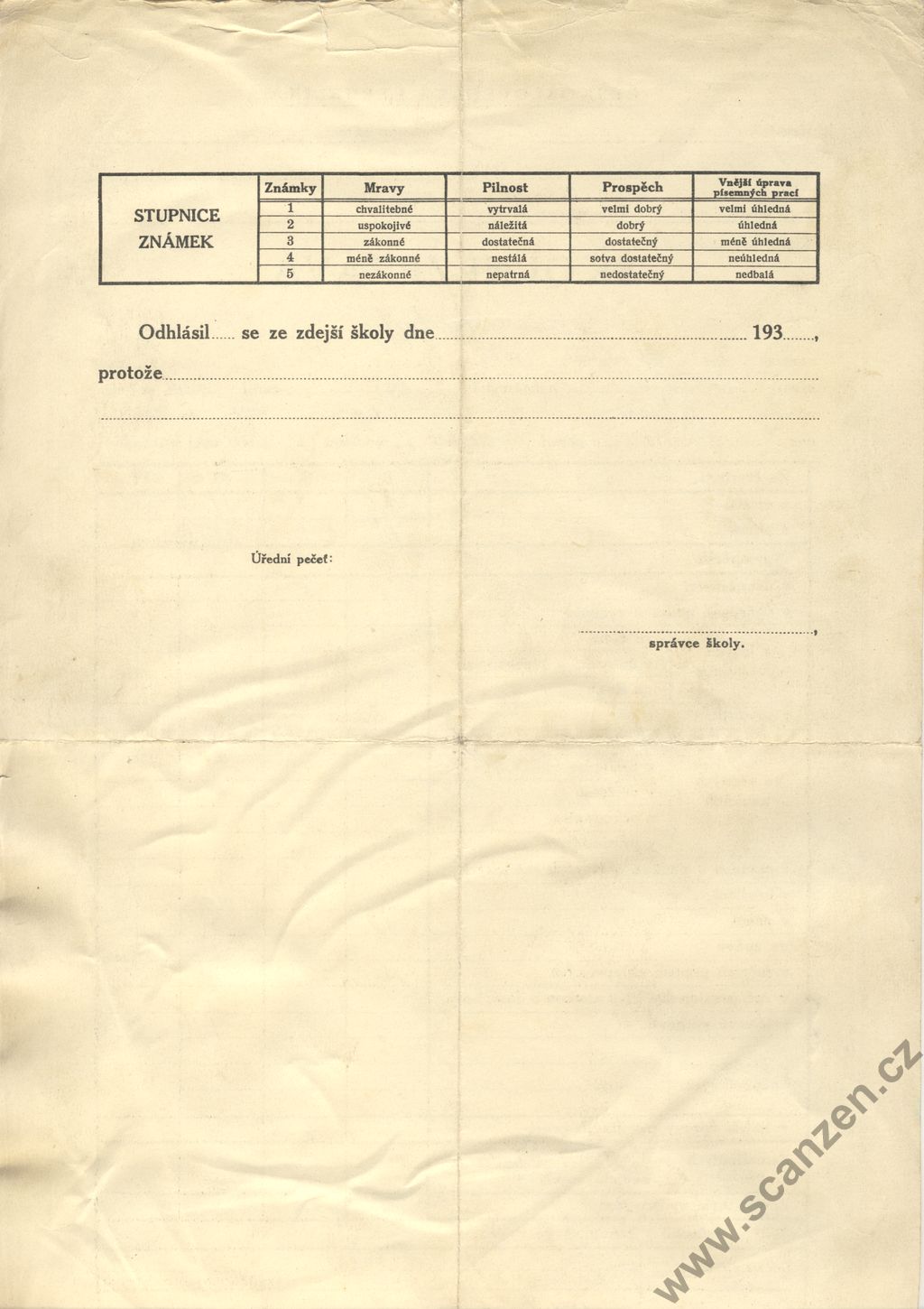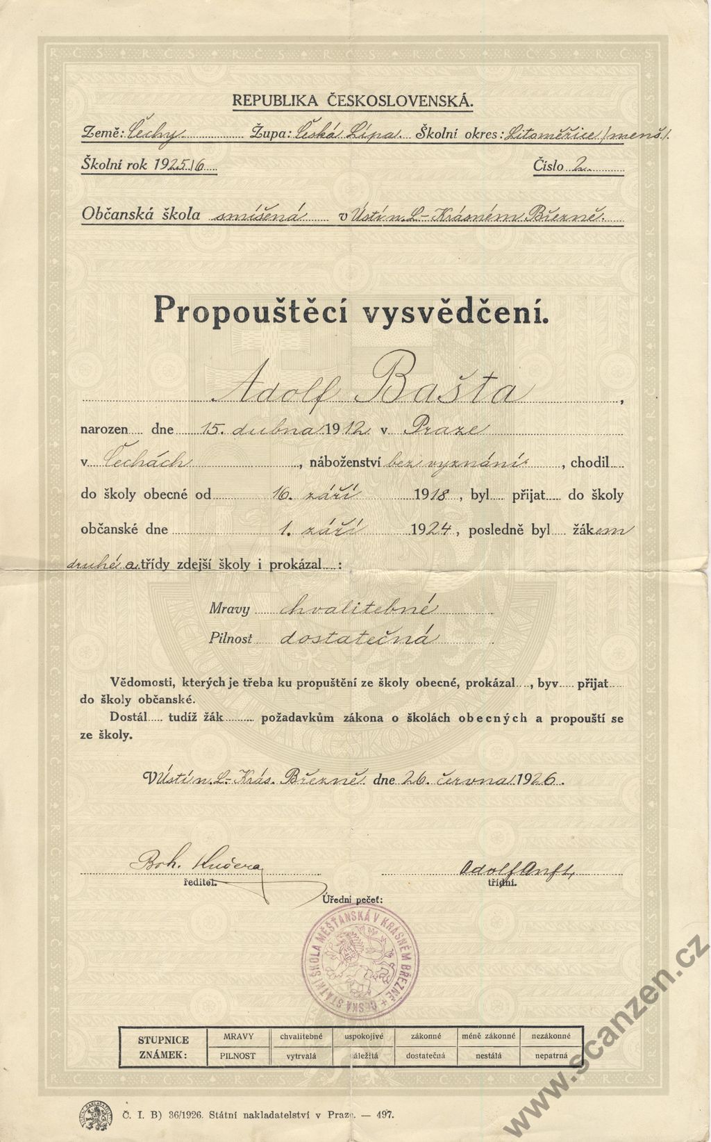 Propouštěcí vysvědčení ze školy obecné (1926)