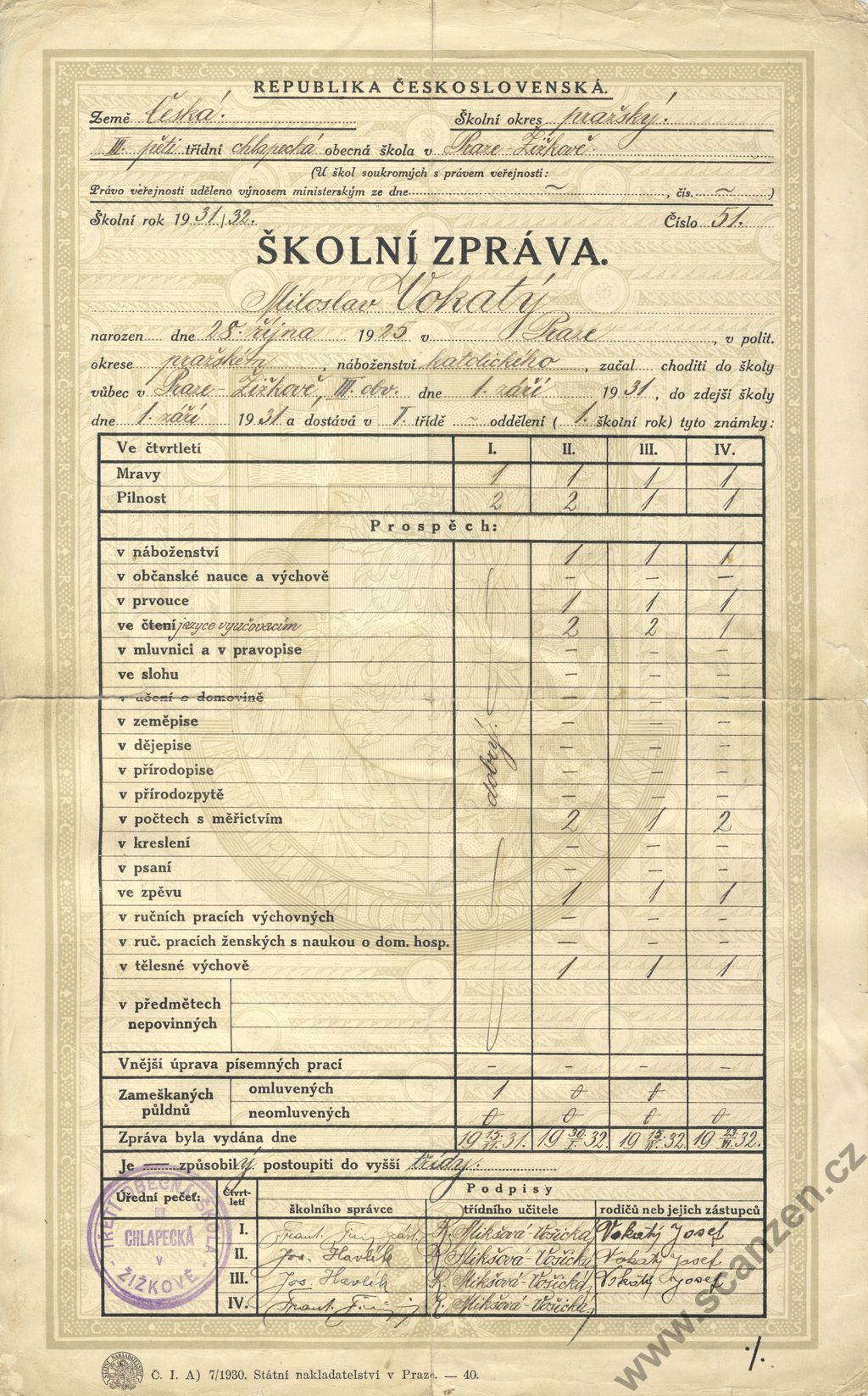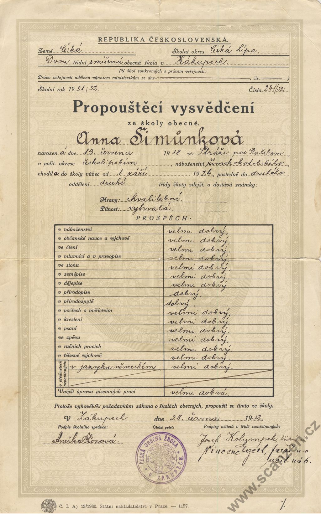 Propouštěcí vysvědčení ze školy obecné (1932) p1
