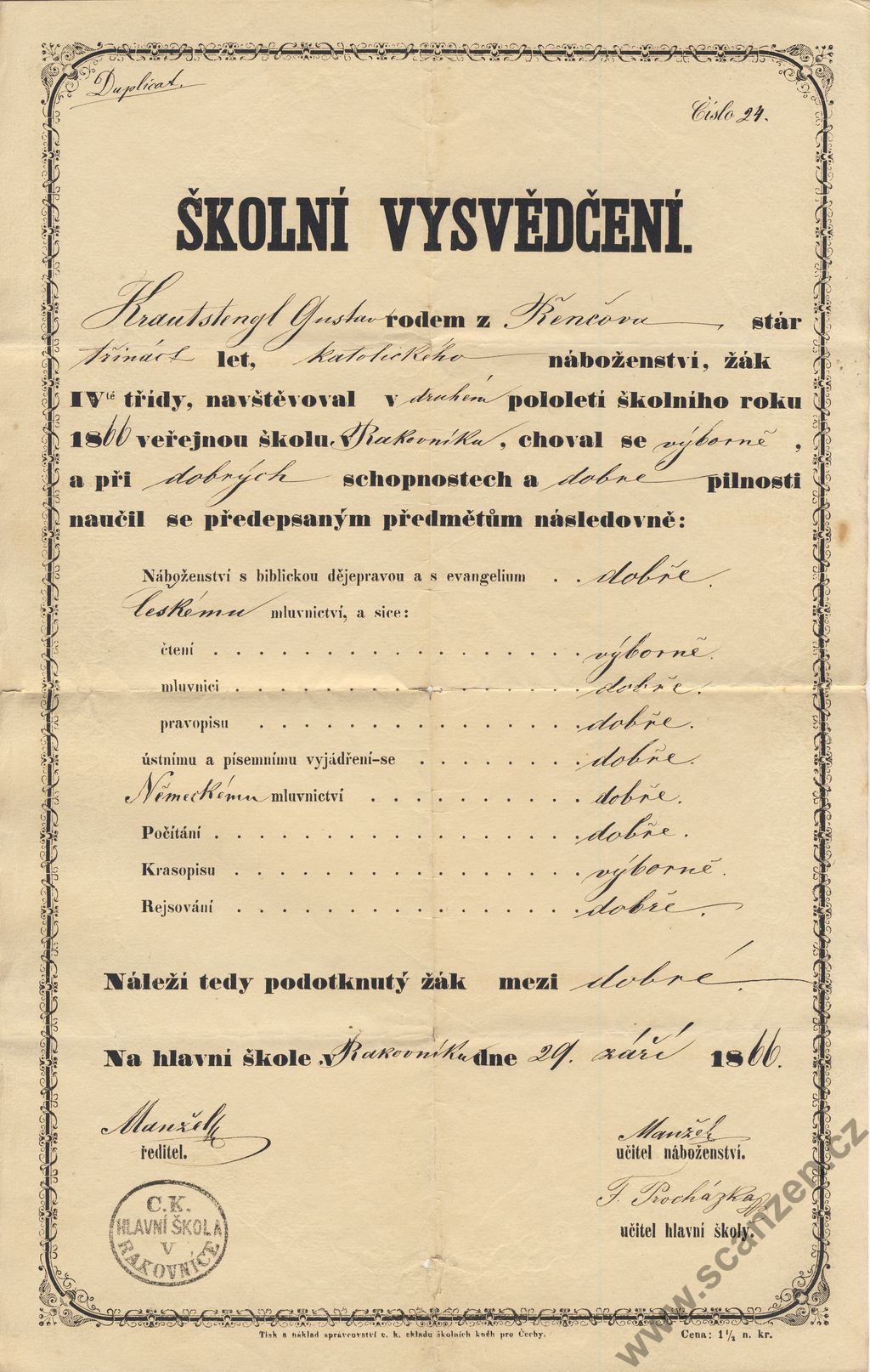 Školní vysvědčení veřejná škola v Rakovníku (1866)