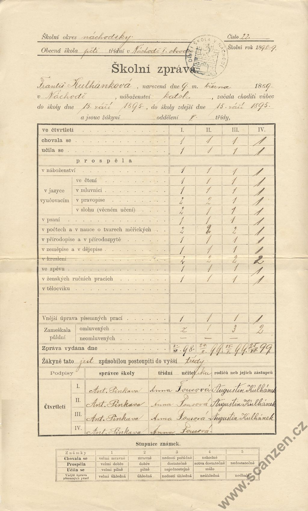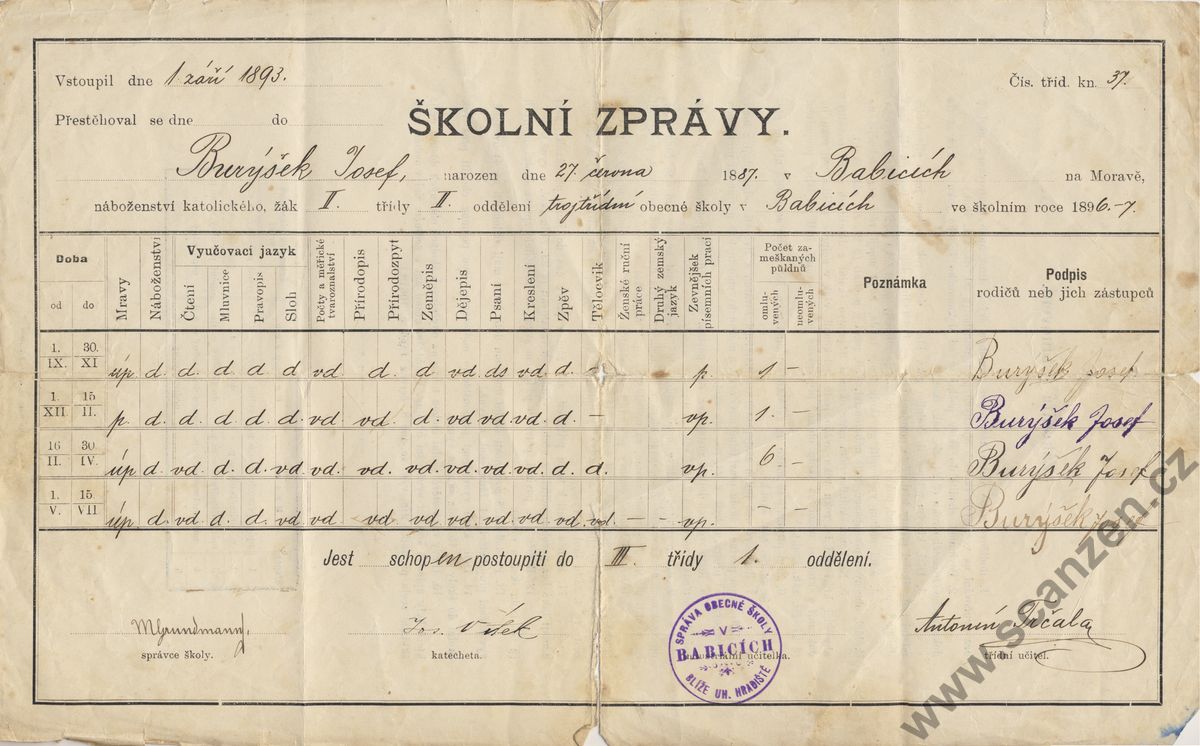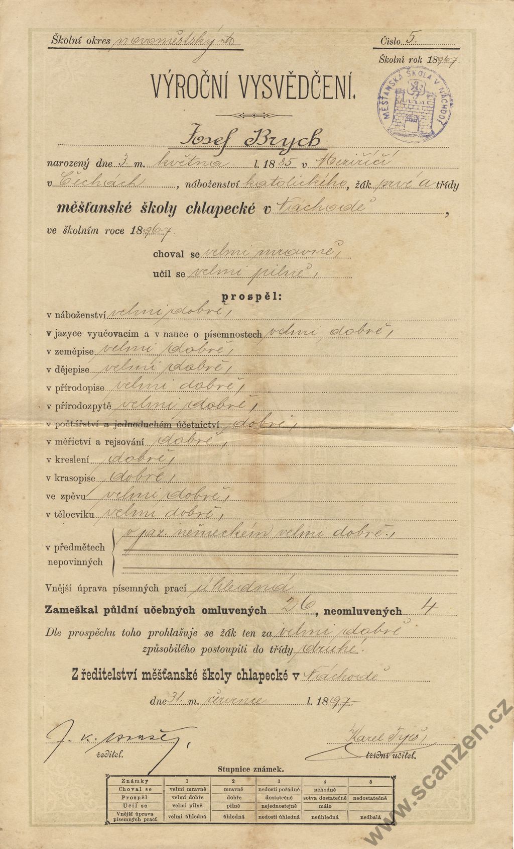 Výroční vysvědčení měšťanská škola (1897)