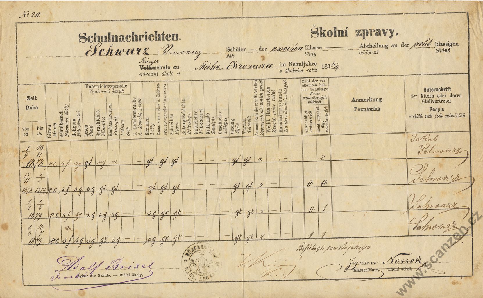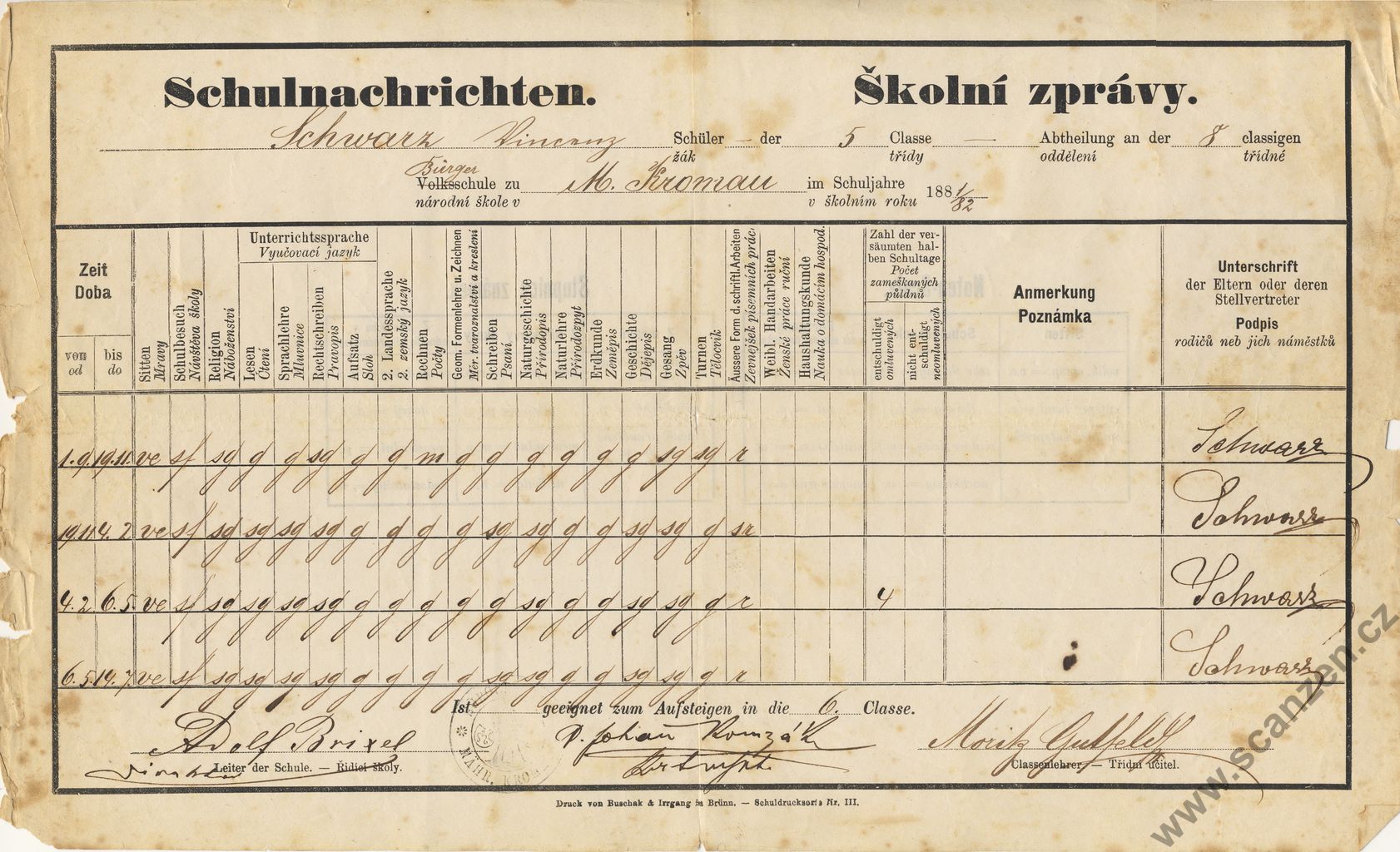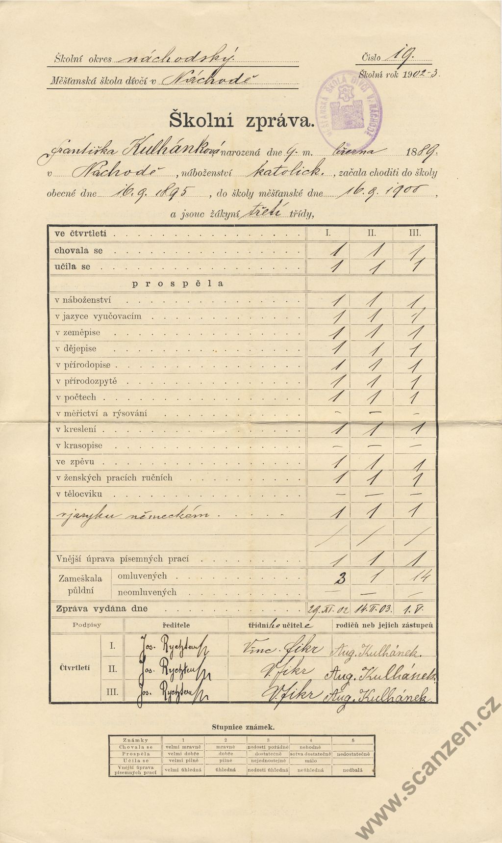Výroční vysvědčení měšťanská škola (1897)
