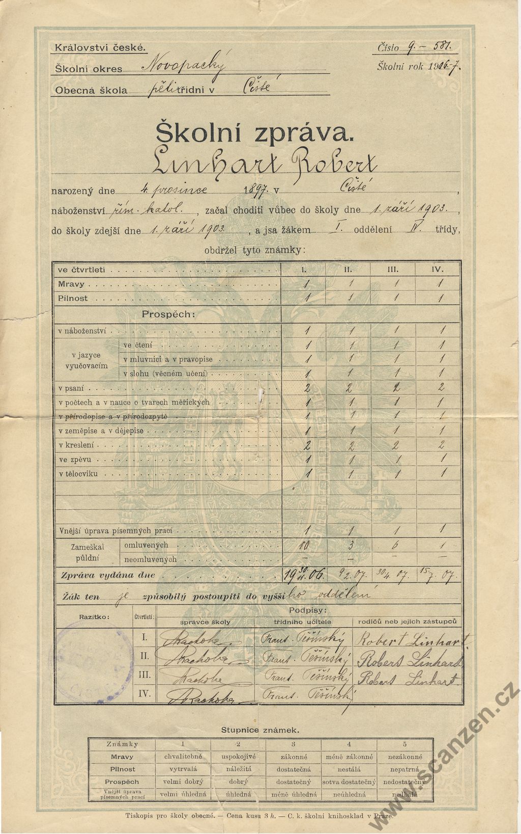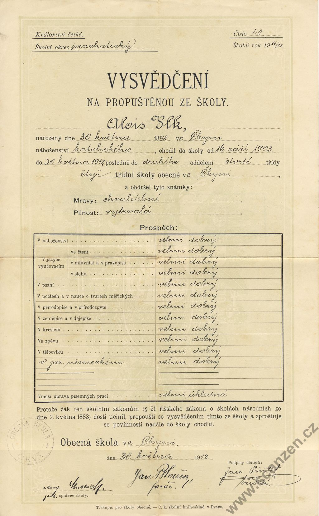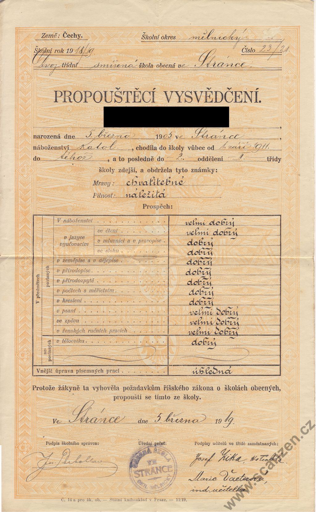 Vysvědčení na propuštěnou ze školy obecné v Maršově (1905)