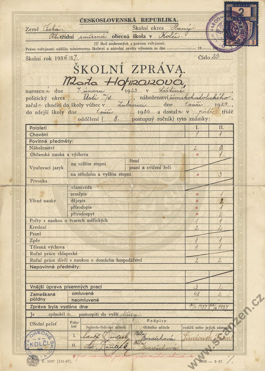Propouštěcí vysvědčení ze školy obecné v Kolči (1937) p1