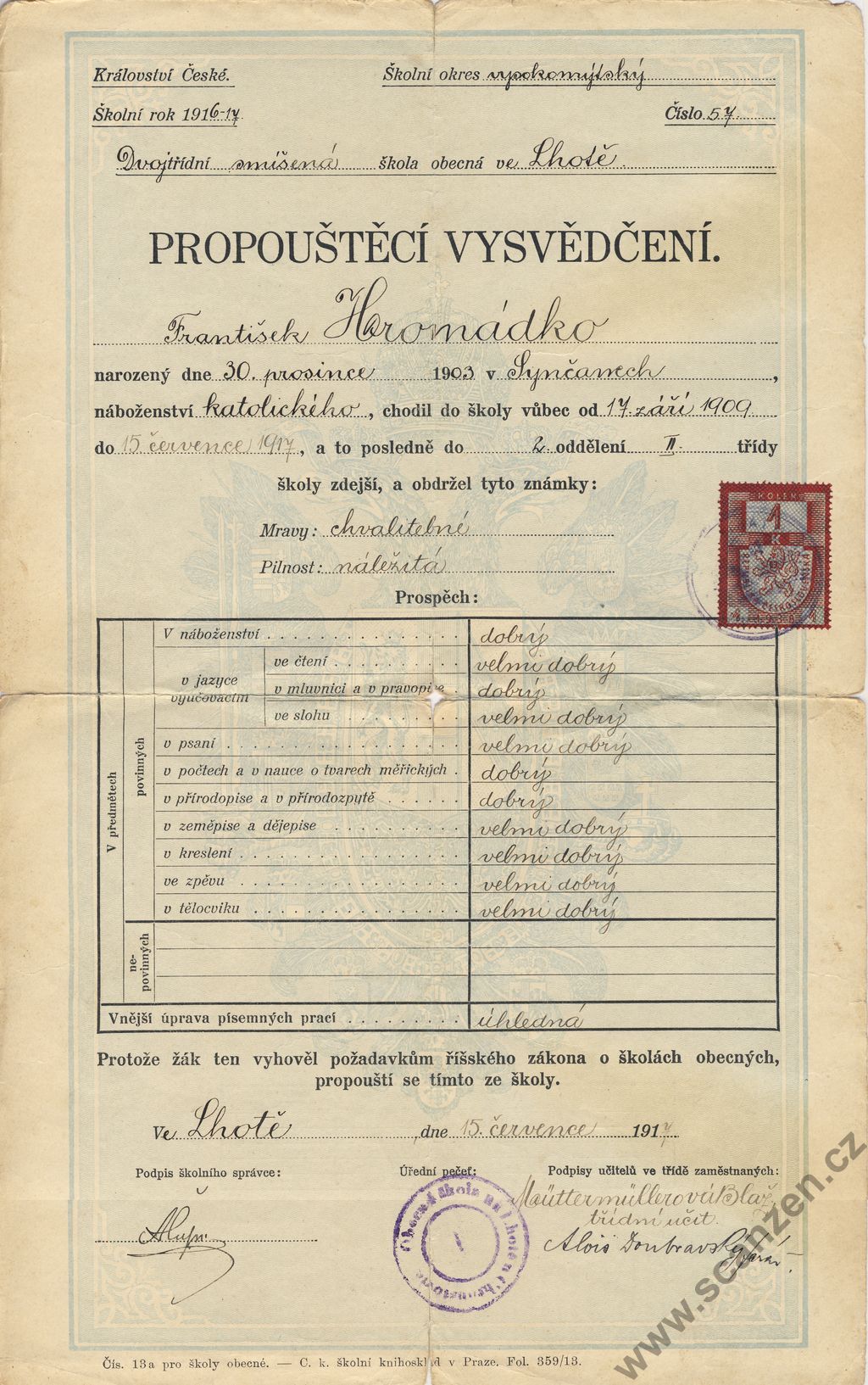 Propouštěcí vysvědčení (1916-17) p1