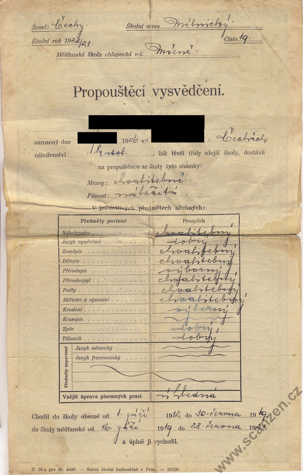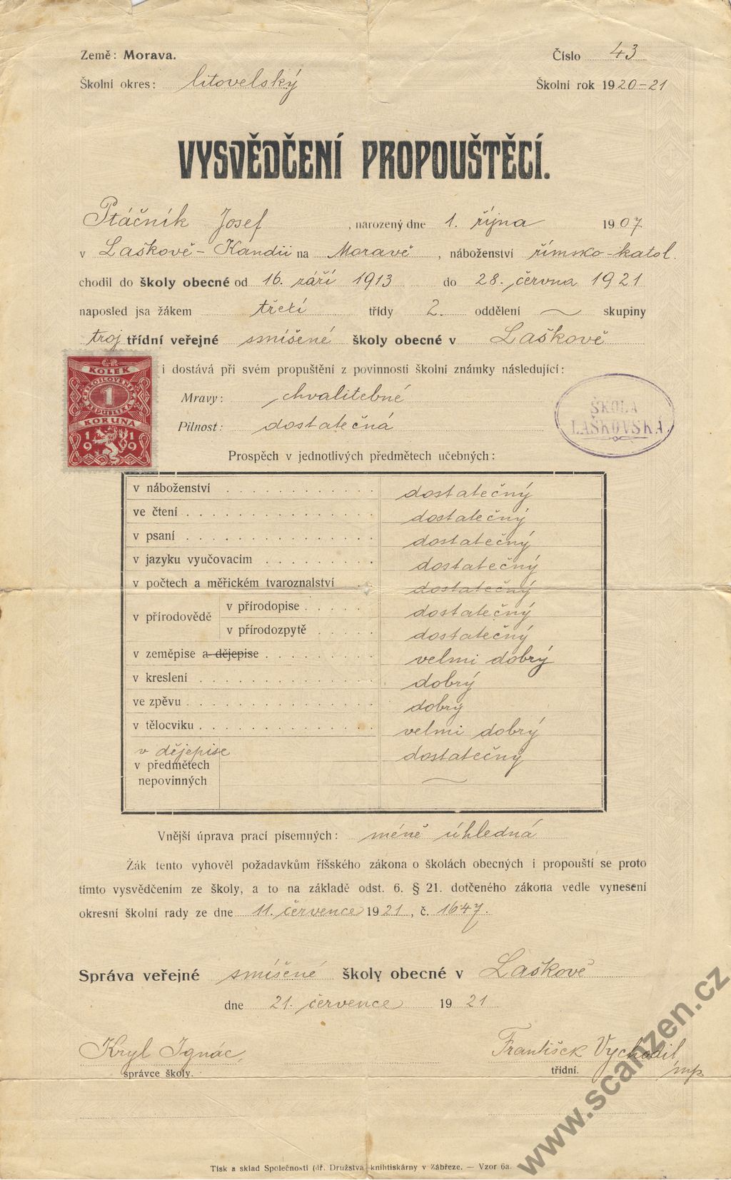 Propouštěcí vysvědčení (1921) p1