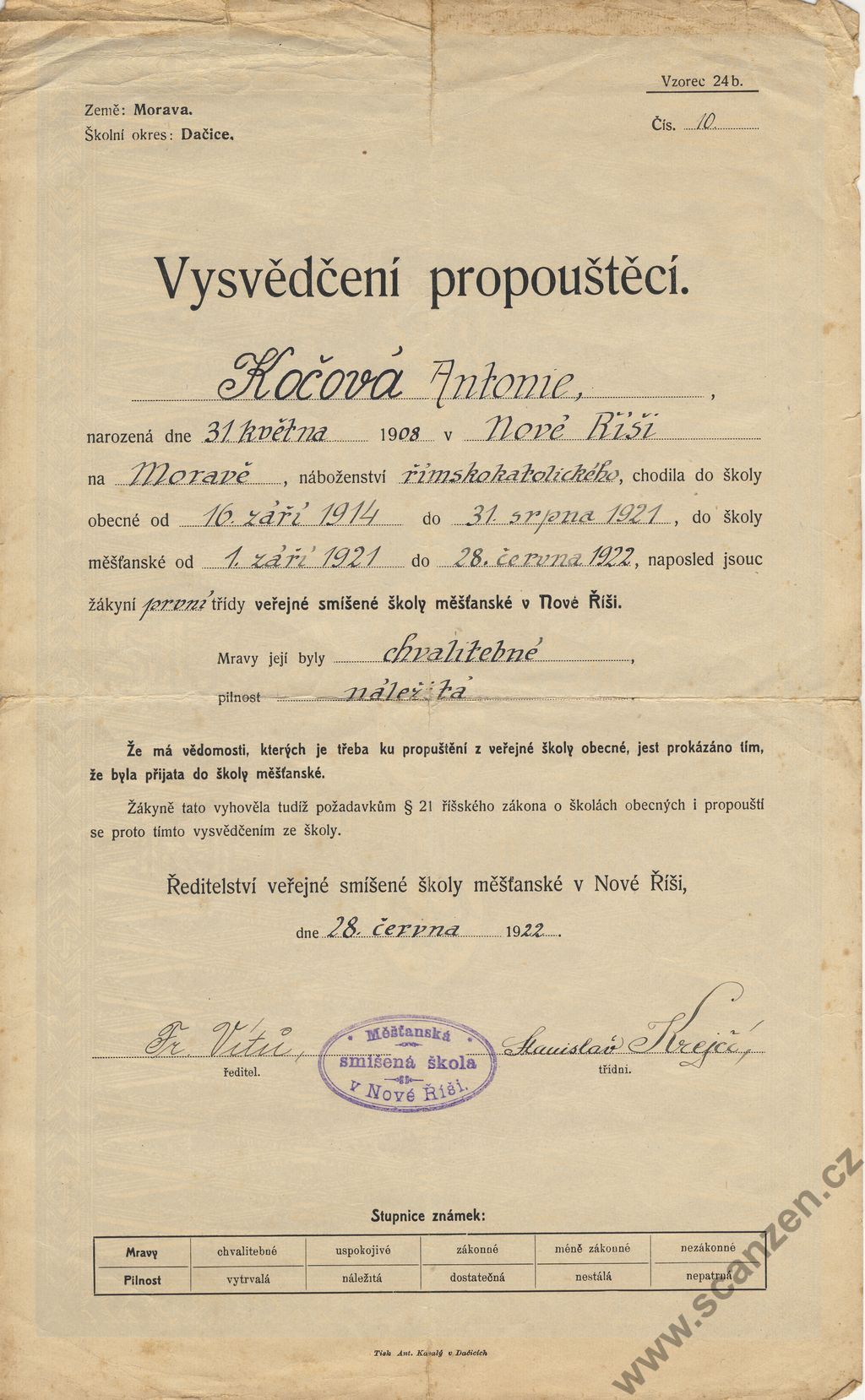 Vysvědčení propouštěcí (1922)