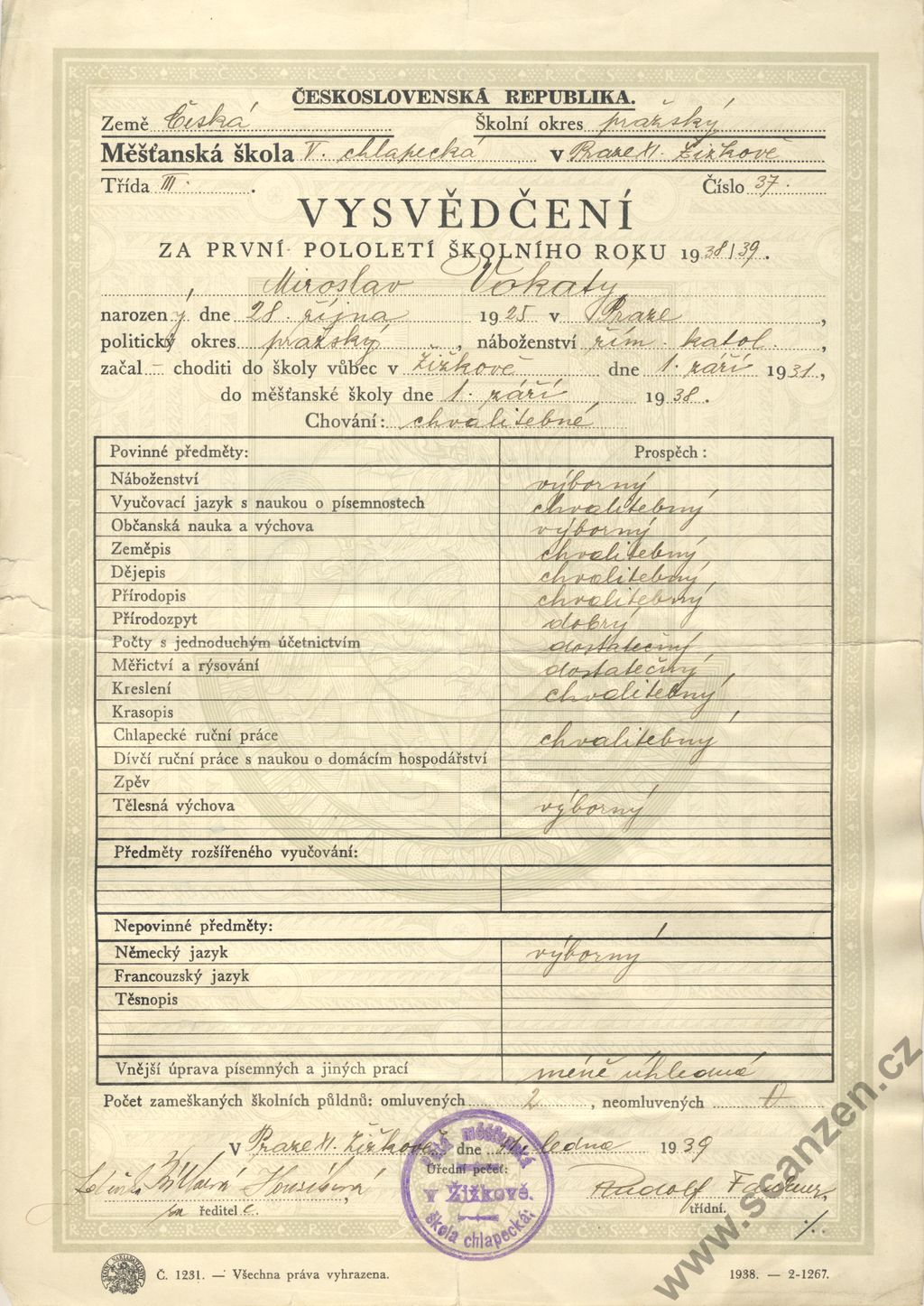 Vysvědčení za 1. pololetí (1939) p1