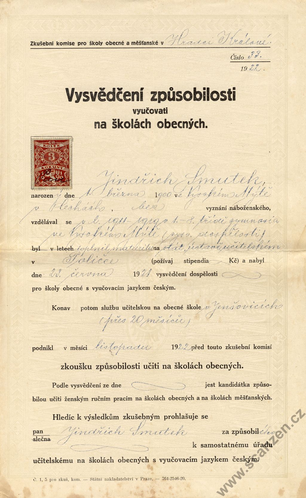 Vysvědčení způsobilosti vyučovati na školách obecných (1922) p1
