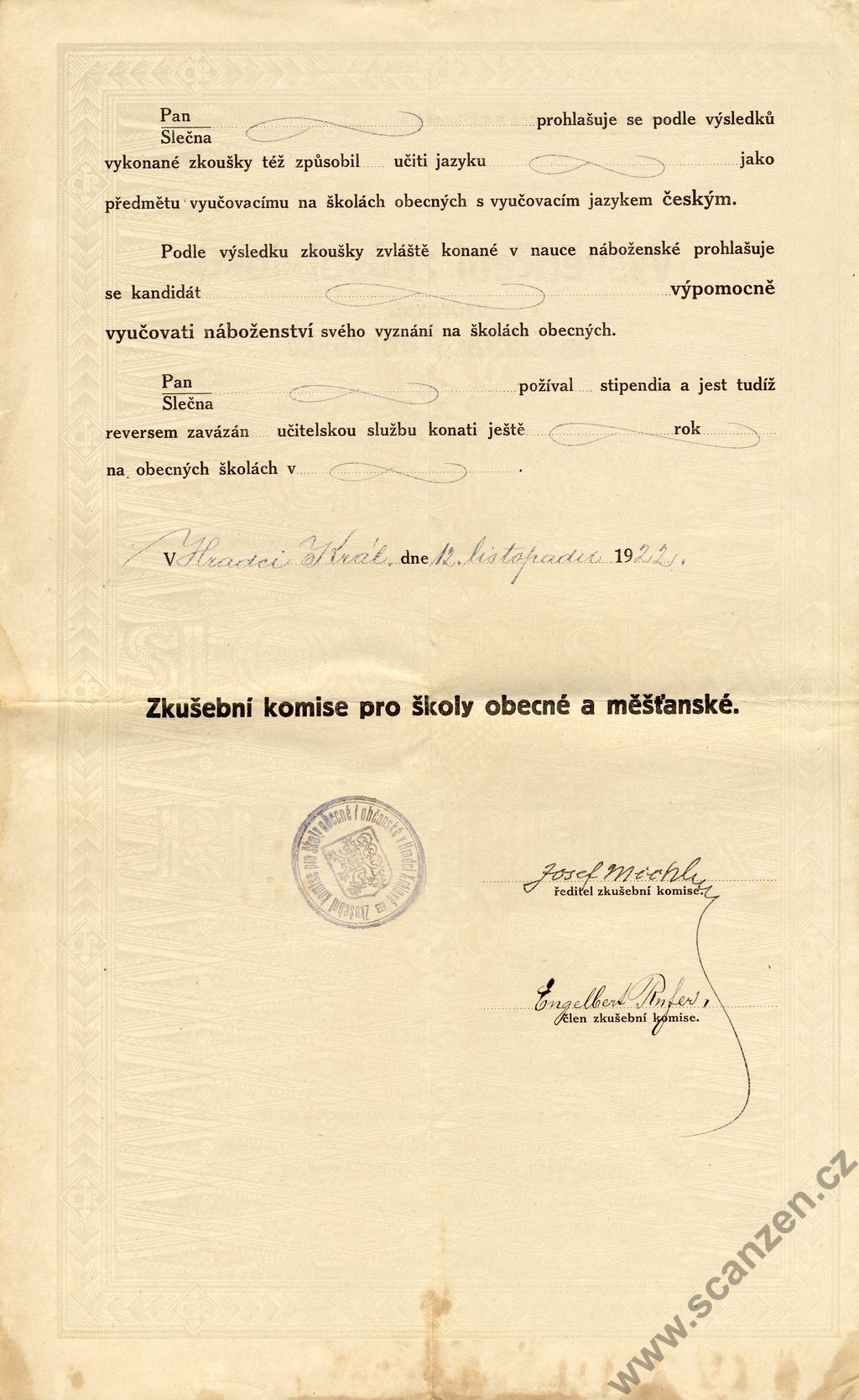 Vysvědčení způsobilosti vyučovati na školách obecných (1922) p2